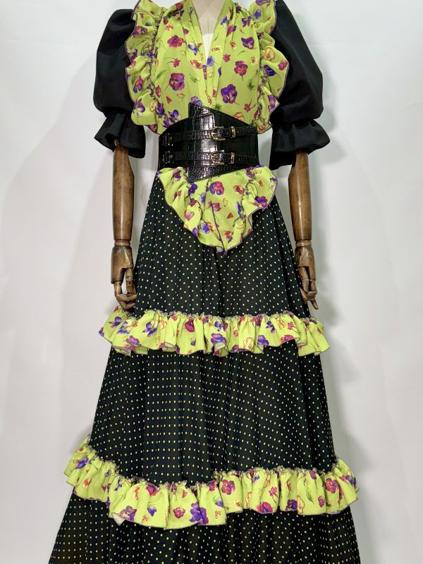 Conjunto mantoncillo y falda cortes negra lunar lima combinada estampada
