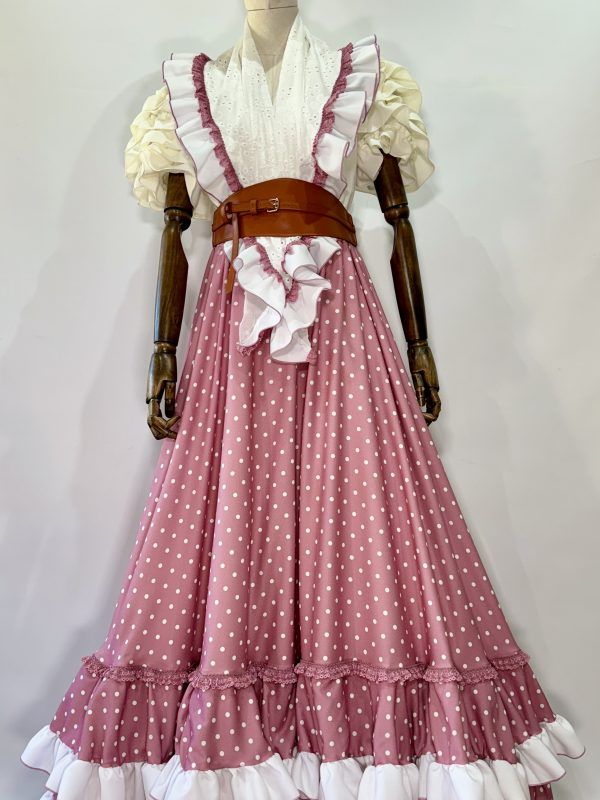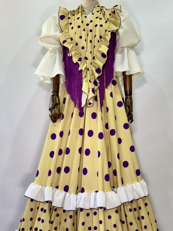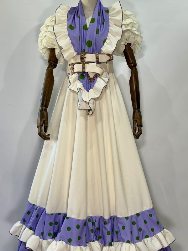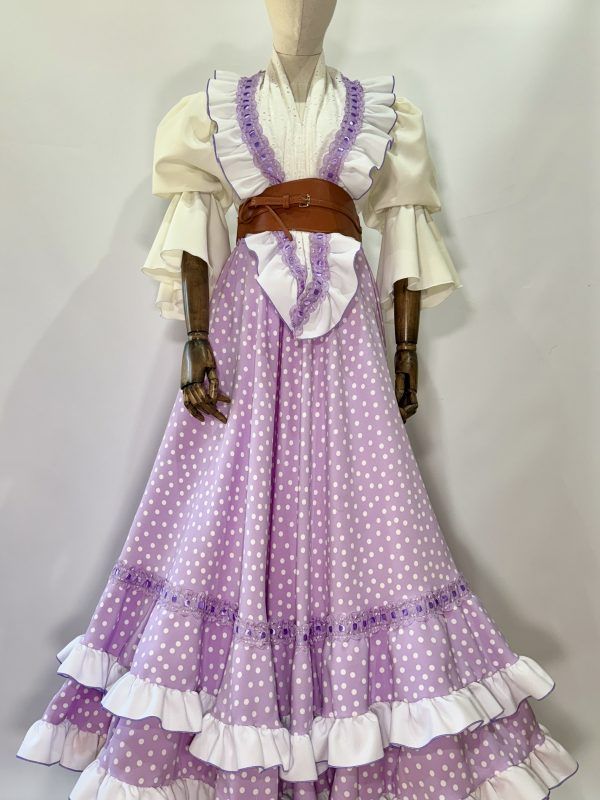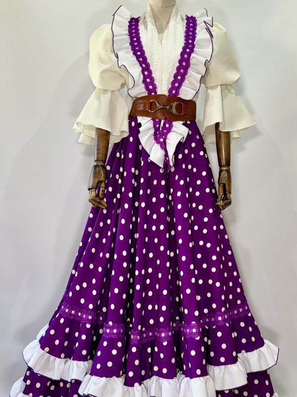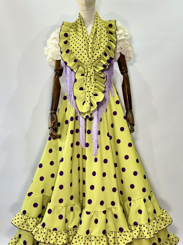 Conjunto mantoncillo y falda beige volantes lila lunar verde