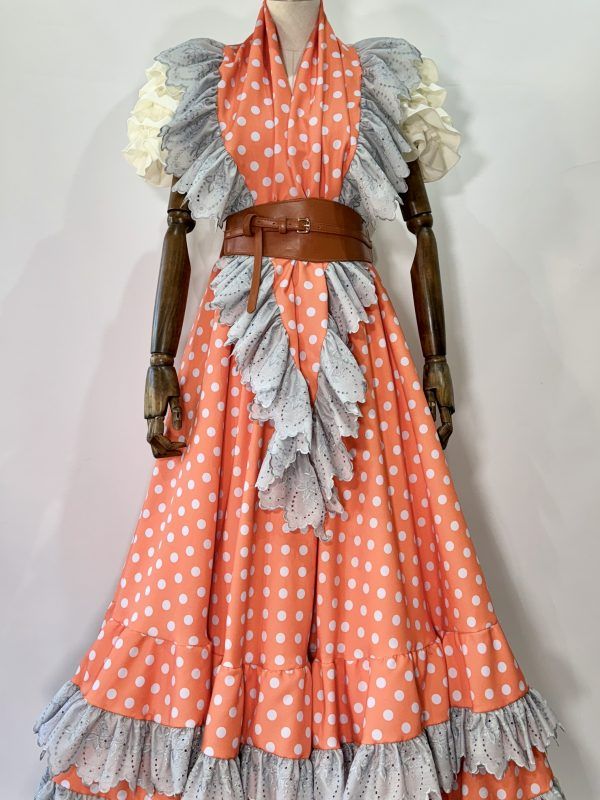 Conjunto mantoncillo y falda naranja lunares tirabordá gris