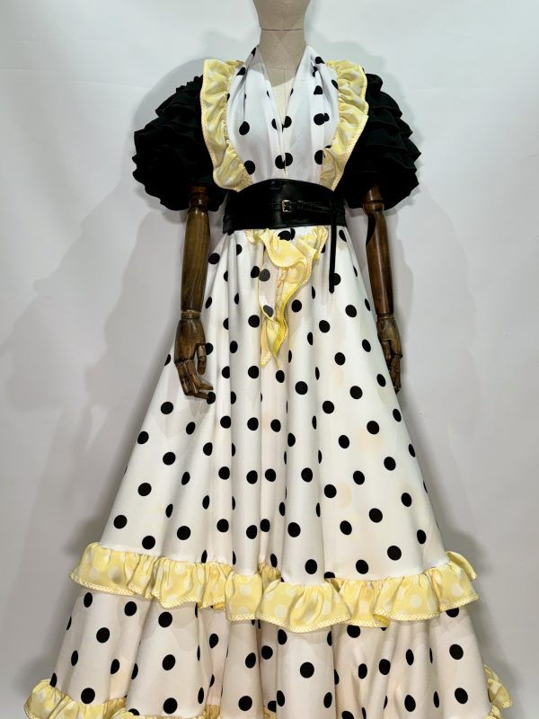 Conjunto mantoncillo y falda blanca lunar negro combinada con amarillo