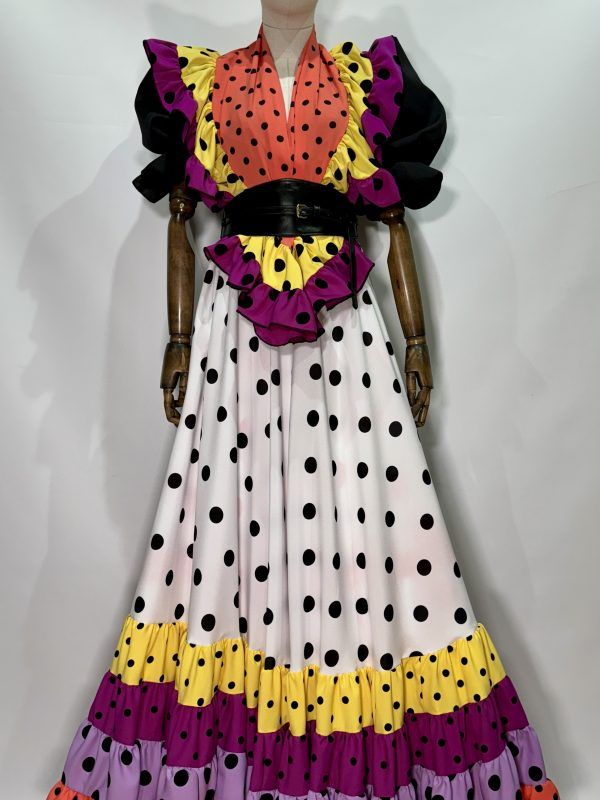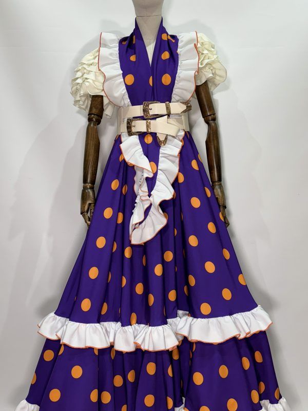 Conjunto mantoncillo y falda morada lunar naranja