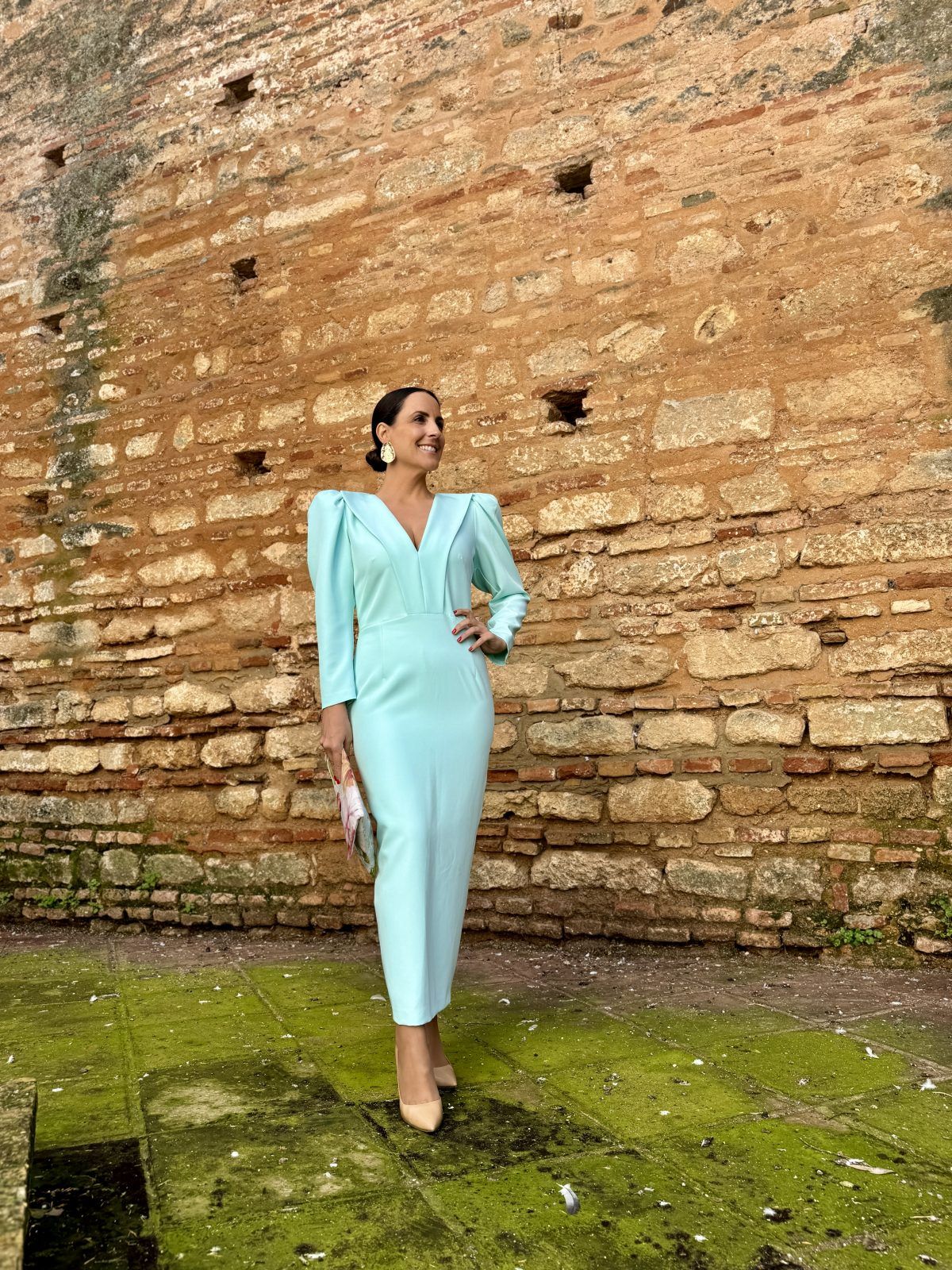 Vestido en crepe bioelástico forrado al tono. Escote en forma de pico, con hombrera un poco abullonada y lleva raja trasera.