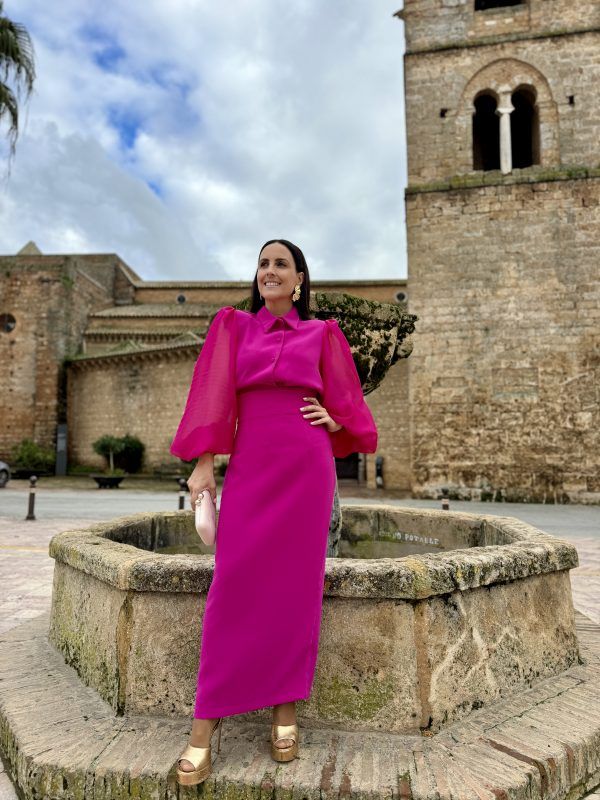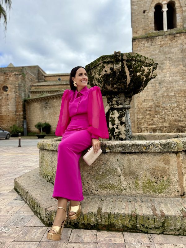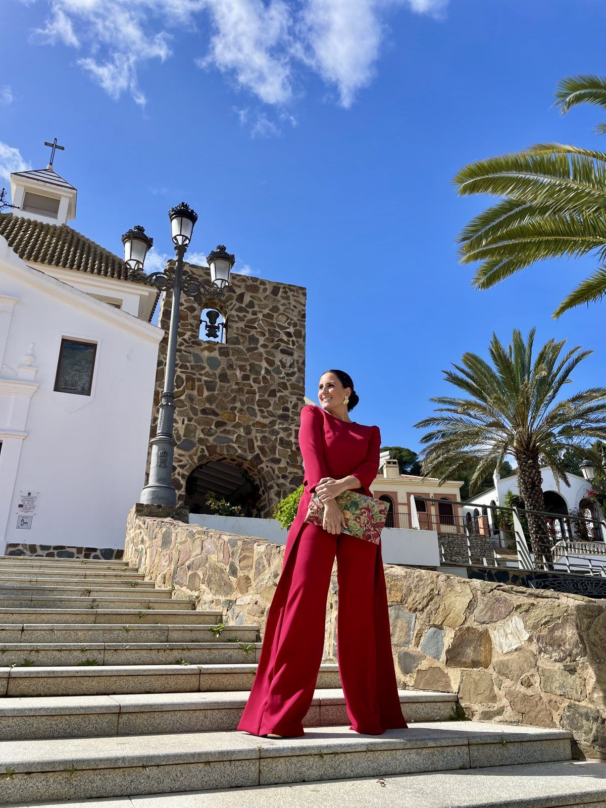 Conjunto de pantalón y top. Top con espalda de pico en crep con elastano y abertura laterales. Pantalón con doble capa.