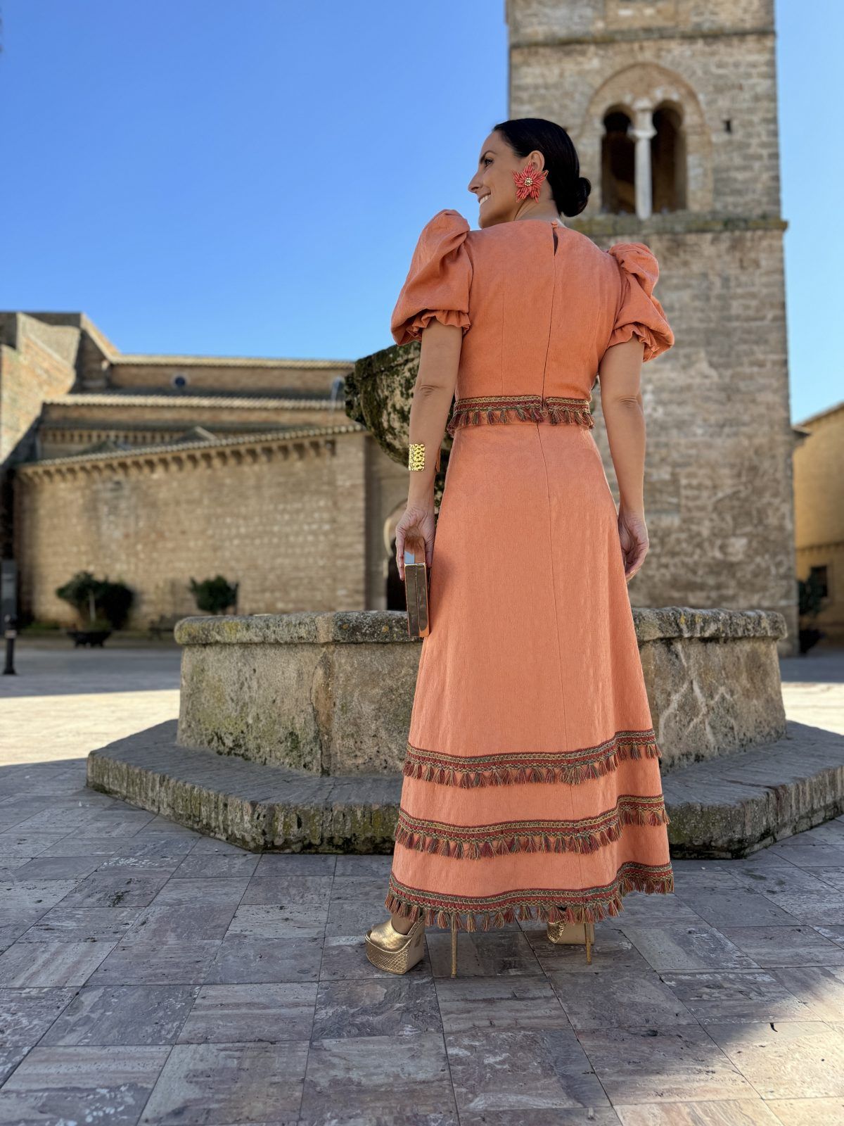 Conjunto dos piezas tejido brocado, falda capa con tiras de bordado con flecos y con abertura delantera y top con manga abullonada y detalle en cintura con tira de bordados de flecos.