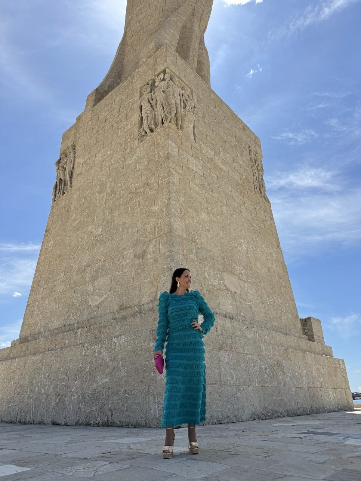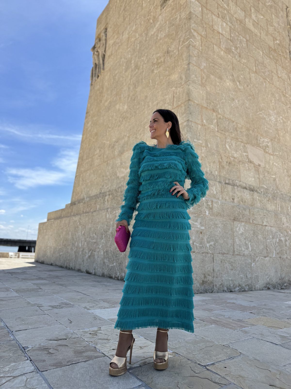Conjunto compuesto por falda y top de flecos. Falda recta y top de manga larga abotonado en la espalda.