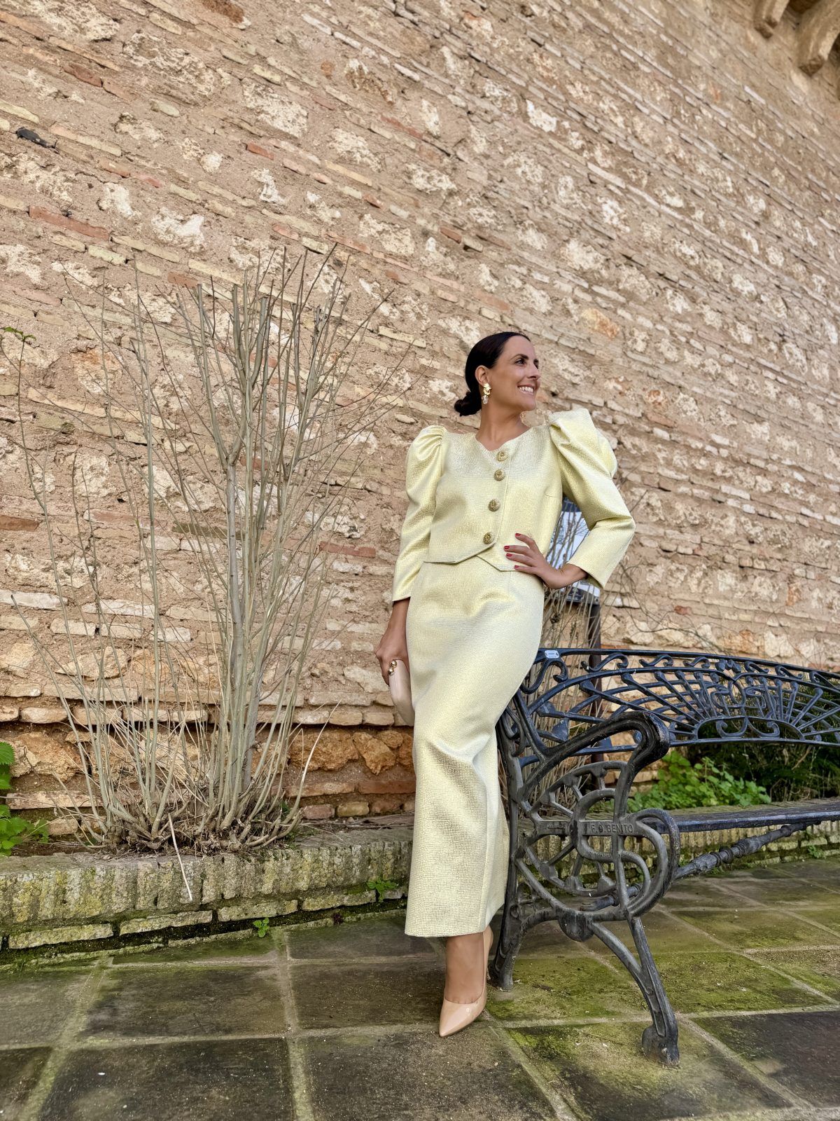 Conjunto de chaqueta y falda en tejido piqué forrado al tono. El toque de distinción lo marca la originalidad de la parte superior que lleva los botones joya lateralizados. La falda es de tiro alto con raja trasera. Un conjunto ideal para arrasar en tu evento como invitada perfecta. Es de color beige y dorado.