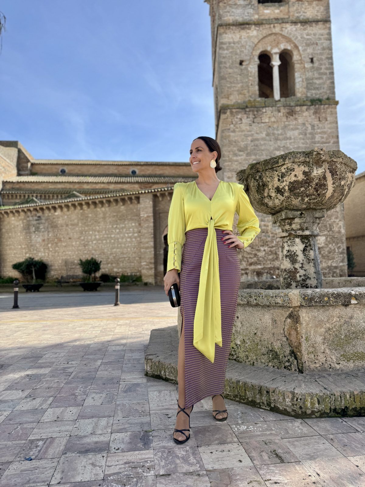 Conjunto de falda y blusa en tejido estampado la falda y la blusa de color lima. El toque de distinción lo marca la blusa que se anuda en la parte delantera de la cintura. La falda lleva raja trasera.