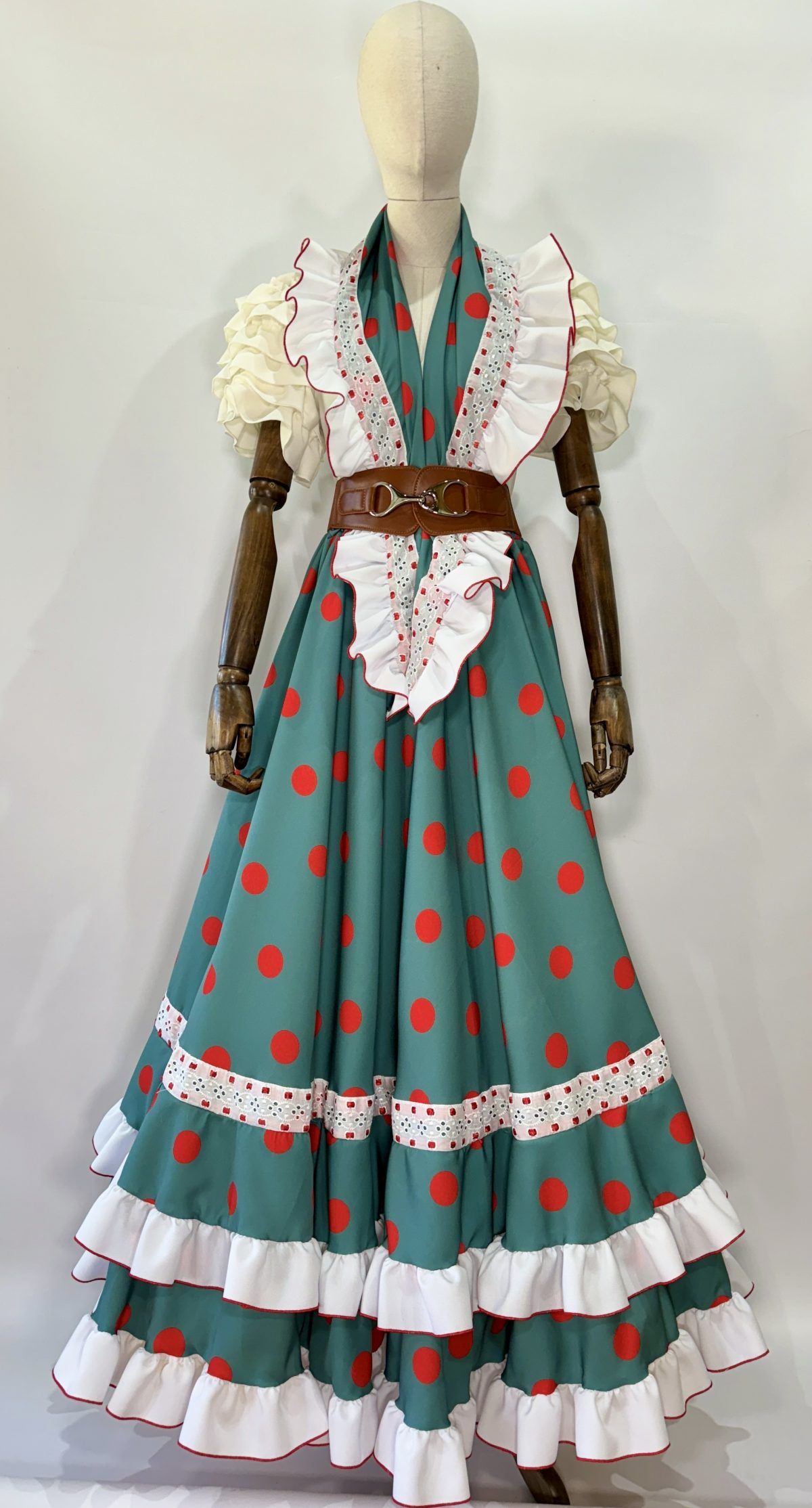 Conjunto de falda y mantoncillo a juego. Falda de capa de dos volantes con volantito blanco en los bajos con repurgo rojo. Pasacinta doble en la costura con lazos rojos. Mantoncillo a juego con la falda con pasacinta doble en la costura.