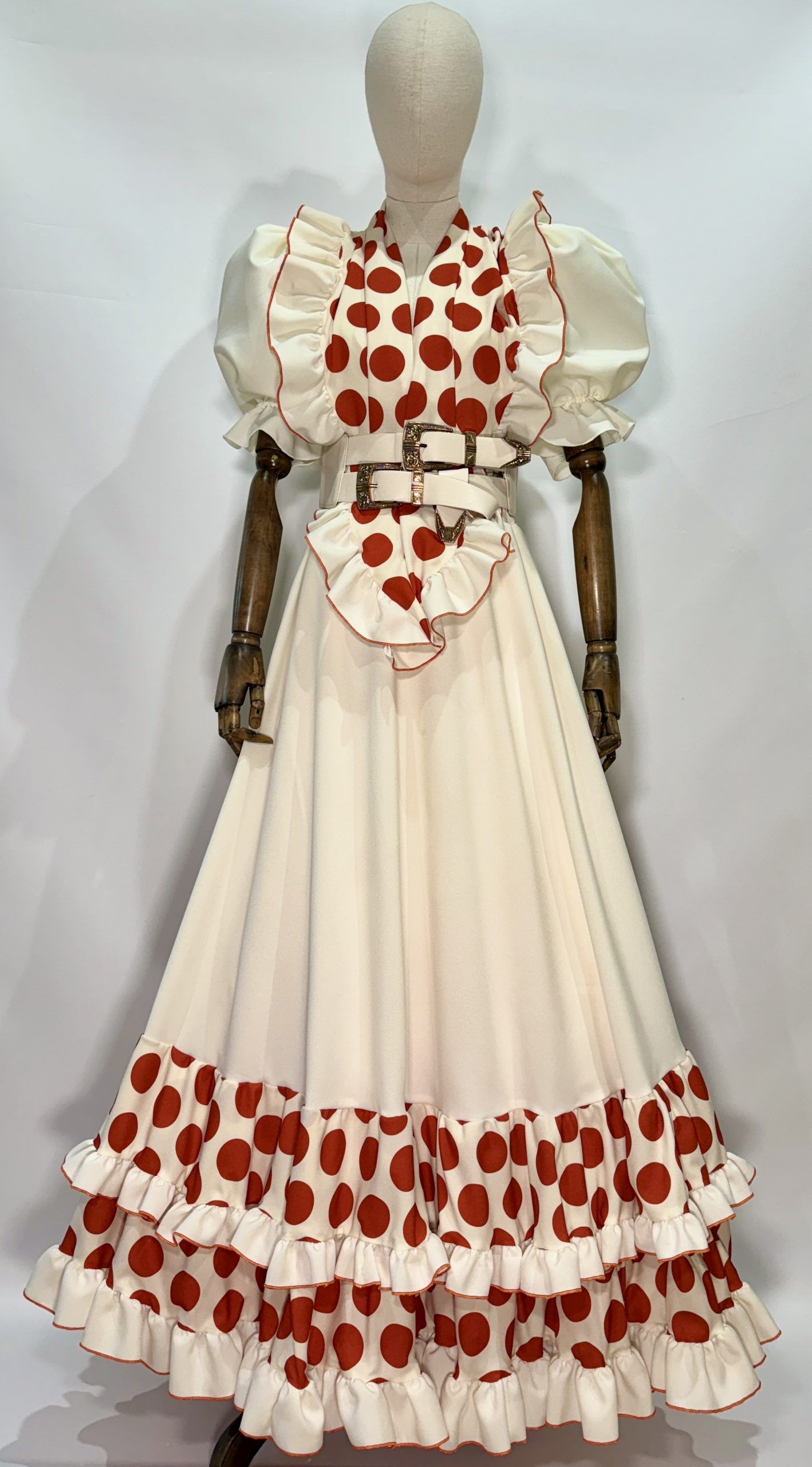 Conjunto de falda y mantoncillo a juego. Falda de capa en color beige con dos volantes beige lunar caldera y volantitos blancos en los bajos con repurgo en color caldera. Cintura elástica. Mantoncillo a juego con la falda.