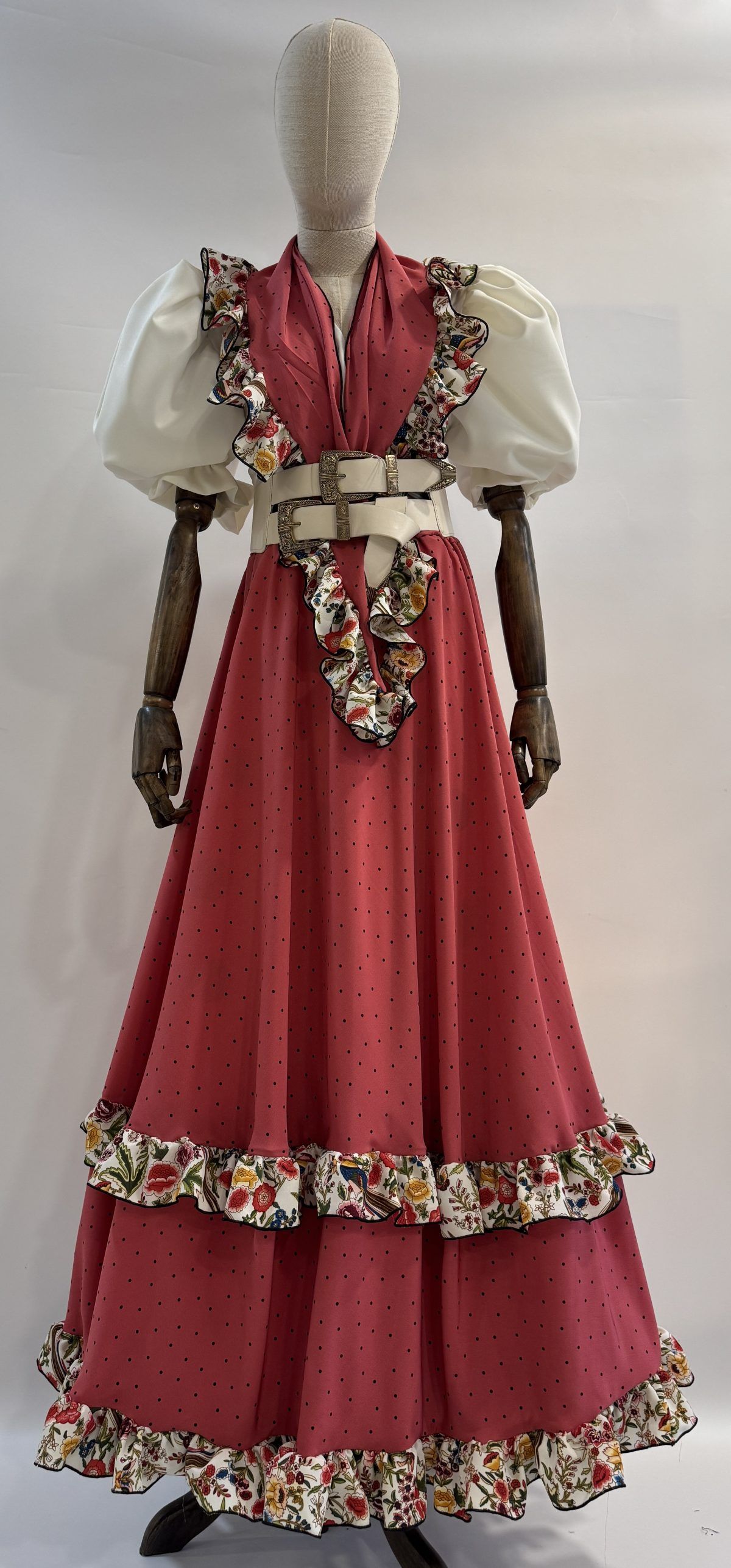Conjunto de falda y mantoncillo a juego. Falda de capa con un volante grande y volantitos estampados manila en la costura y en el bajo. Cintura elástica. El mantoncillo va a juego con la falda.