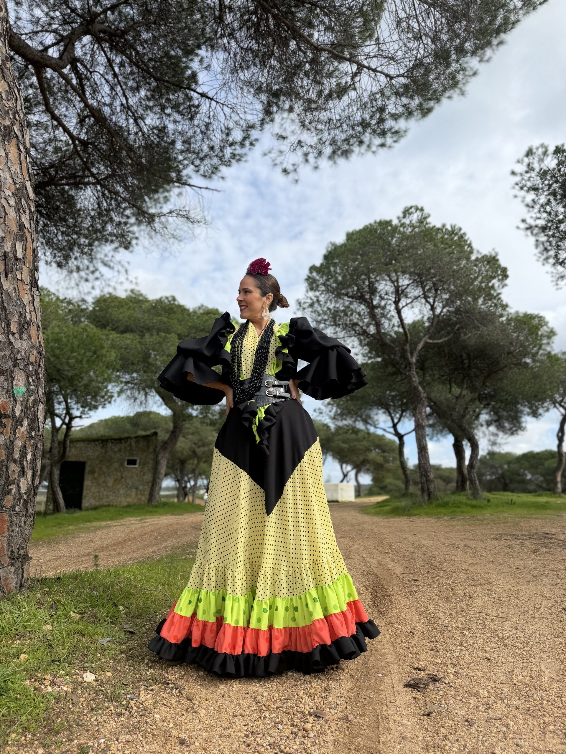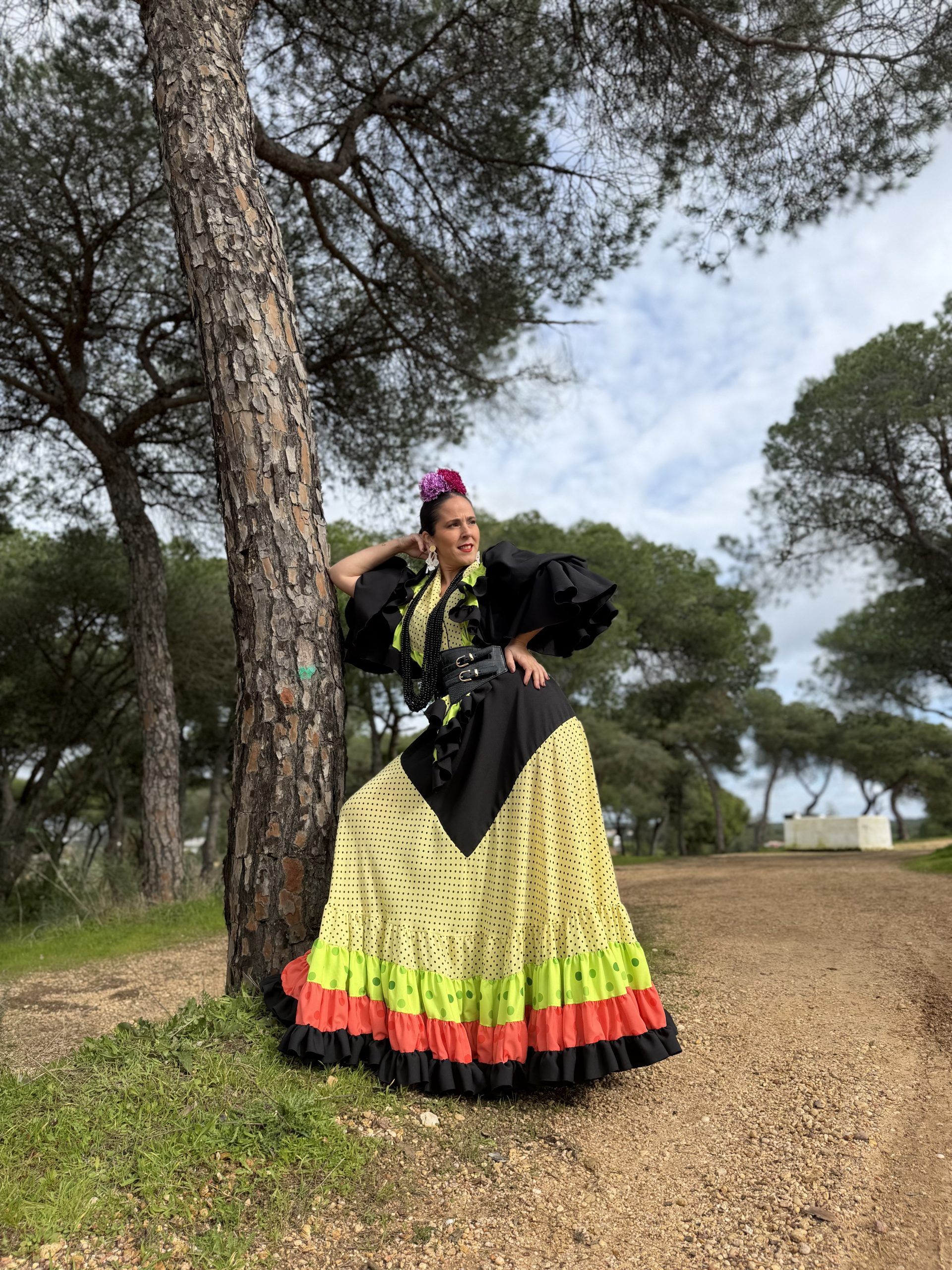 Conjunto de falda y mantoncillo a juego. Falda de capa con corte en pico negro que resalta la figura, en color amarilla con lunar negro, con bajo canastero de colores. Cintura elástica.