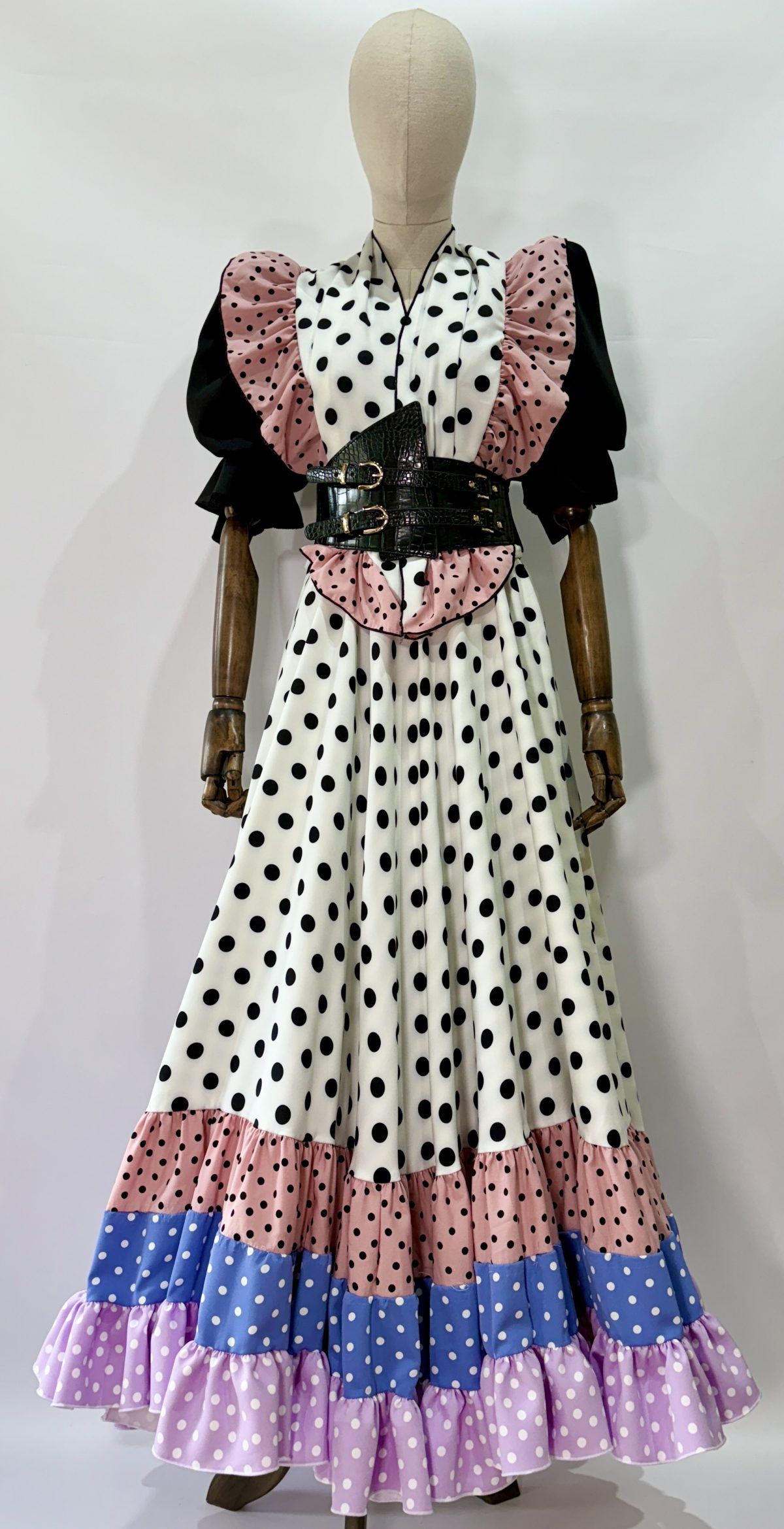 Conjunto de falda y mantoncillo a juego. Falda de capa blanca lunar negro con bajo canastero en colores, nude lunar negro, azulón lunar blanco, lila lunar blanco. Mantoncillo a juego con la falda y cintura elástica.