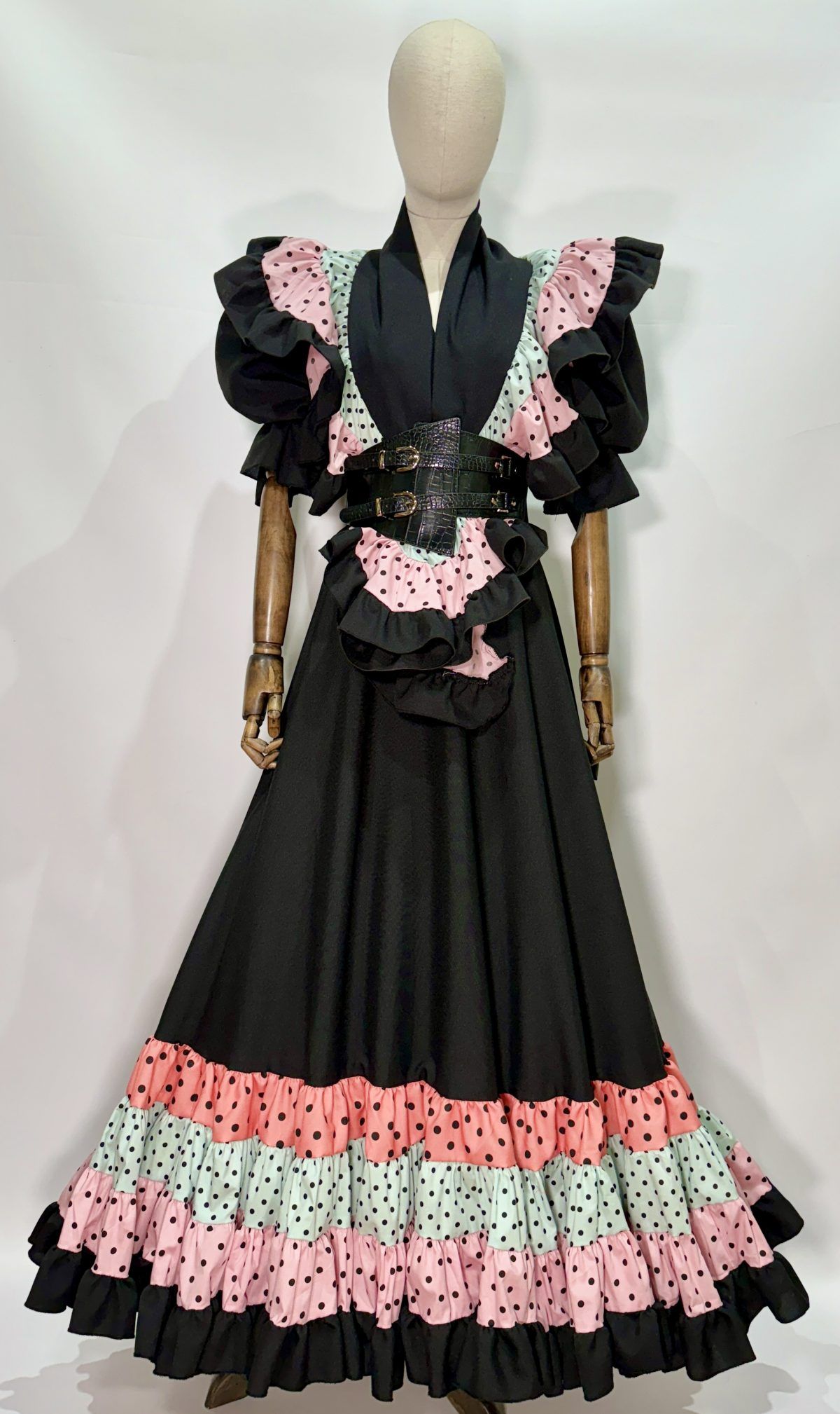 Conjunto de falda y mantoncillo a juego. Falda de capa con bajo canastero en colores, coral lunar negro, verde lunar negro, rosa lunar negro y negro. Mantoncillo a juego con la falda.