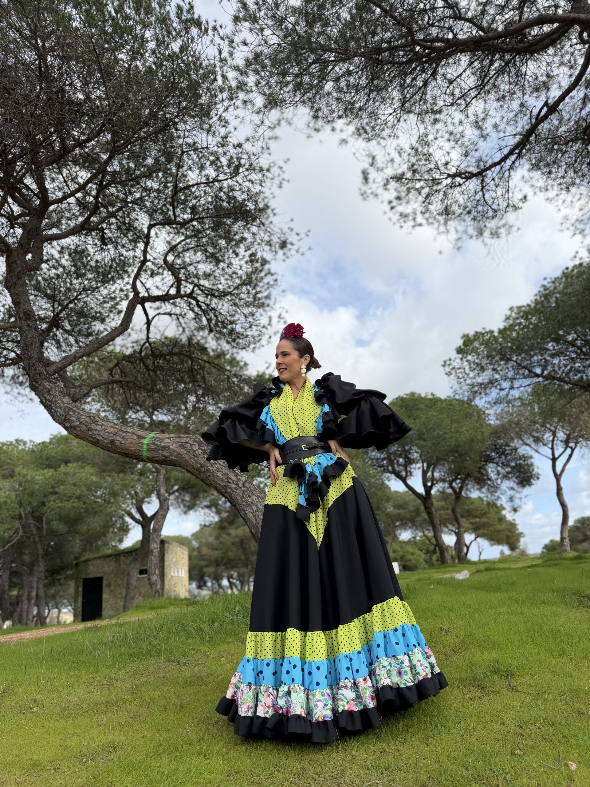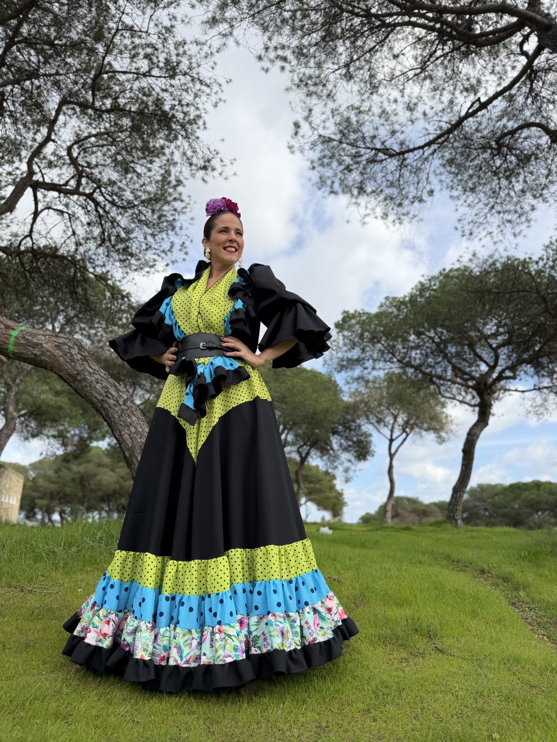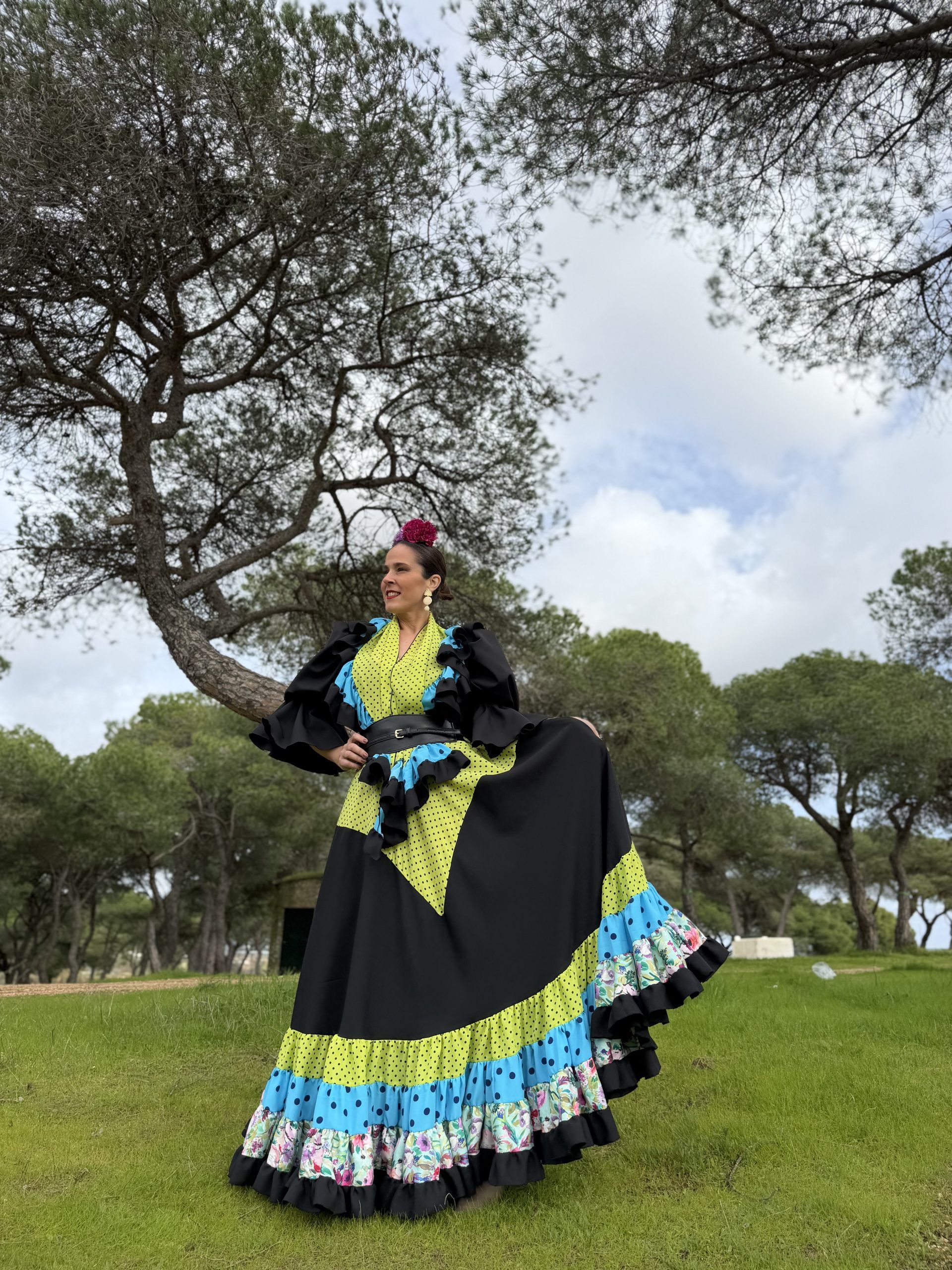 Conjunto de falda y mantoncillo a juego. Falda de capa con corte en pico verde lunar negro que resalta la figura, en colo negra con bajo canastero de colores. Cintura elástica.