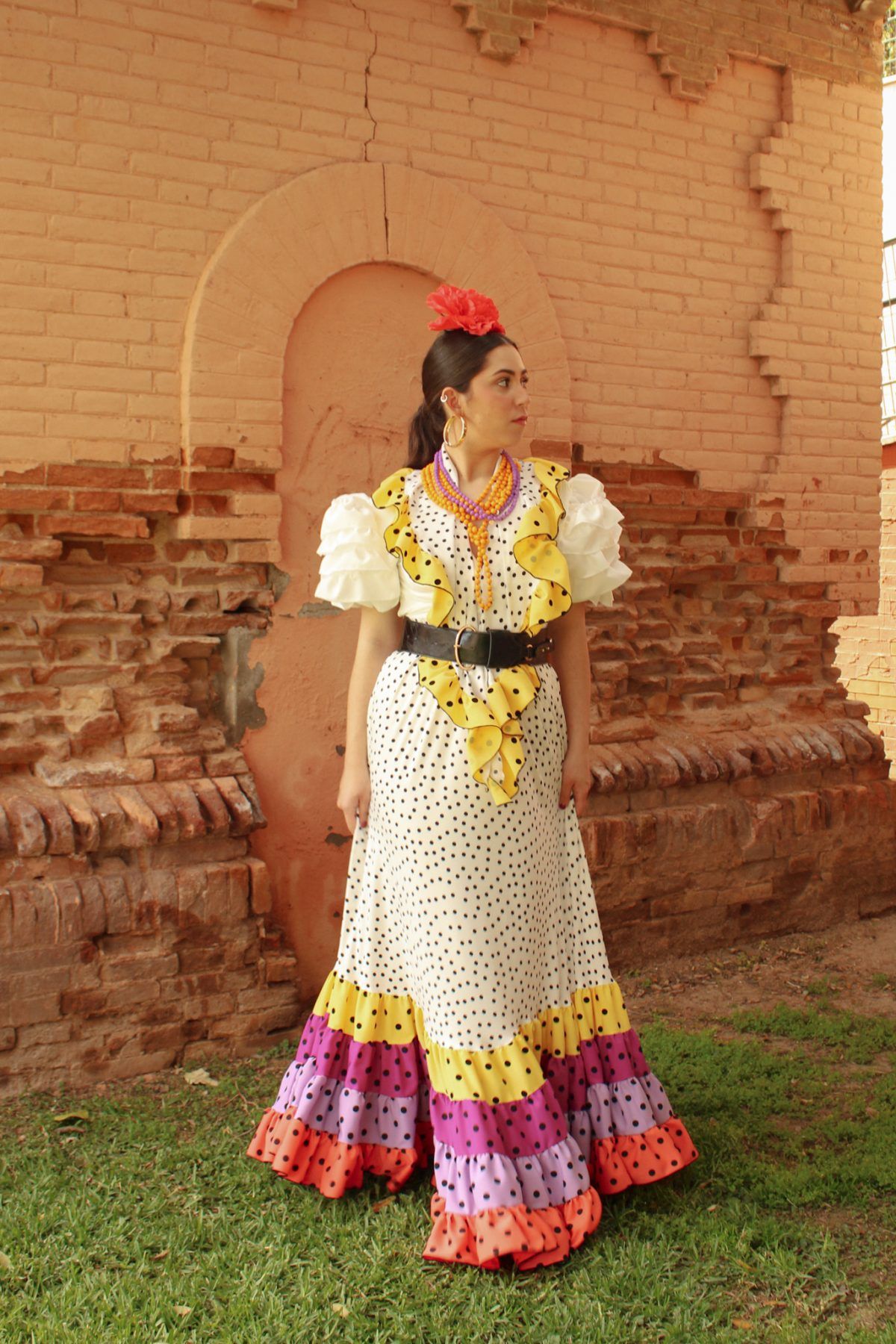 Conjunto de falda y mantoncillo a juego. Falda de capa con bajo canastero en colores.