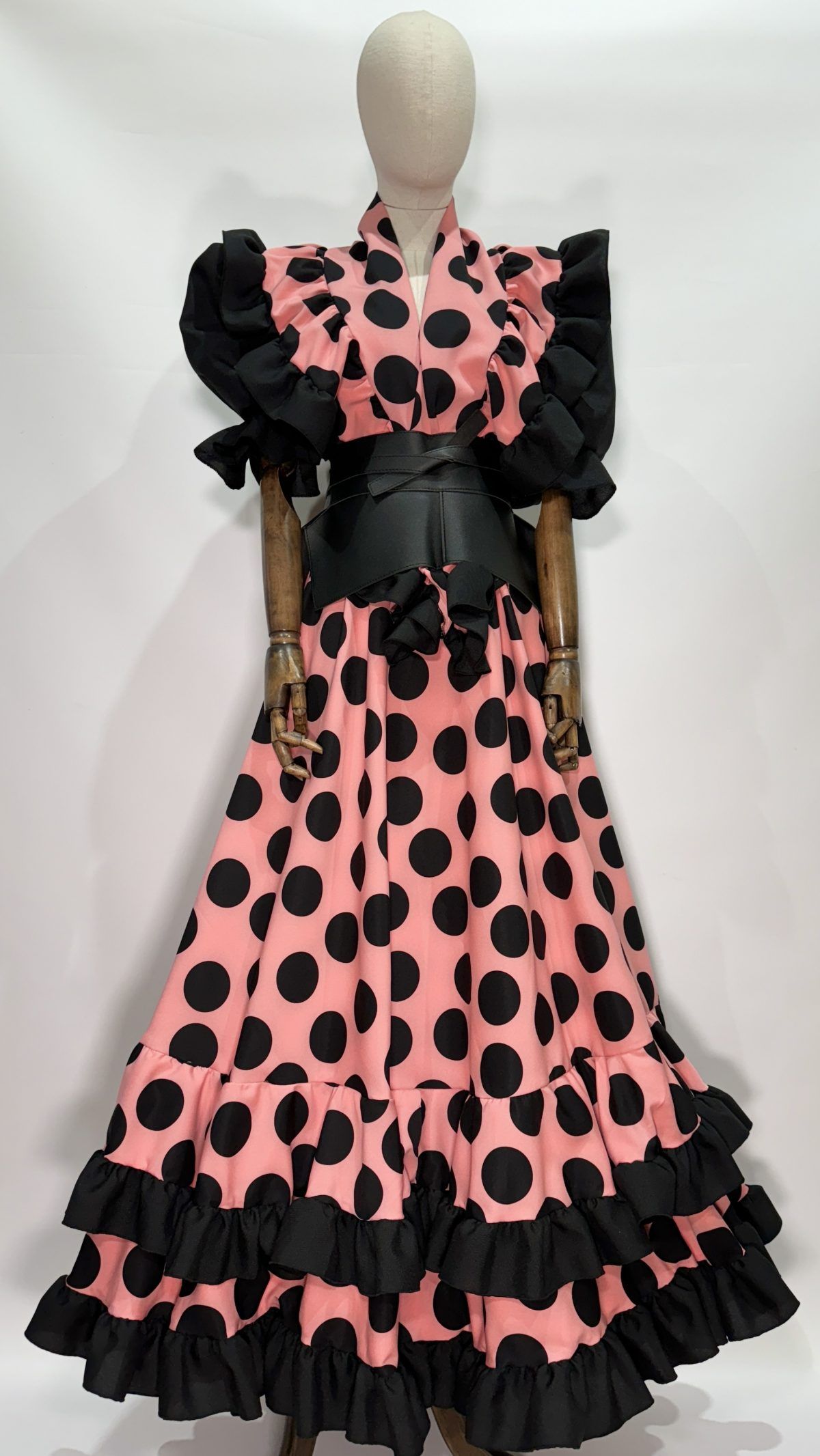 Conjunto de falda y mantoncillo a juego. Falda de capa con dos volantes con volantito negro en los bajos. Mantoncillo a juego con la falda.