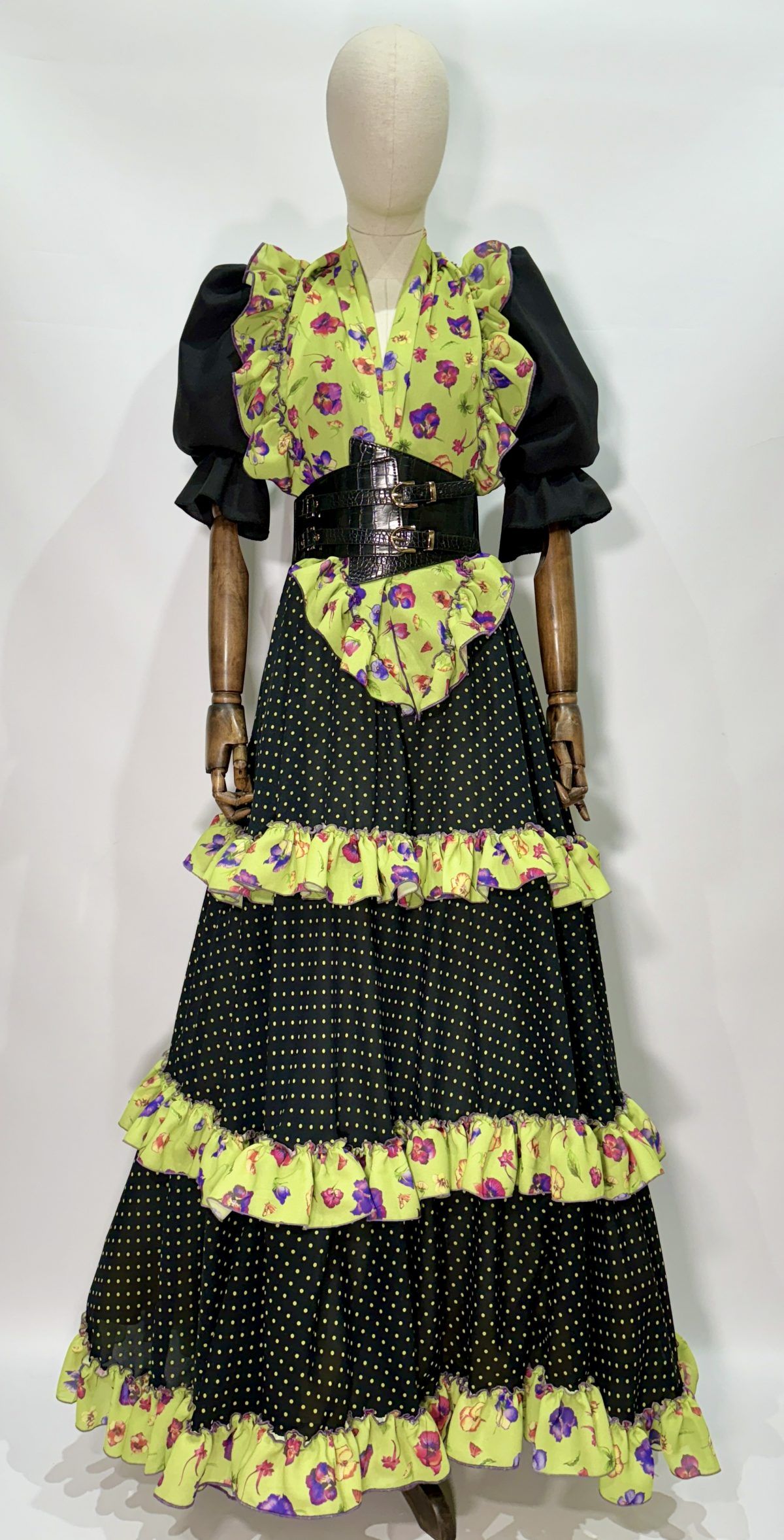 Conjunto de falda y mantoncillo a juego. Falda capa de tres cortes con volantito estampado de flores en cada corte. El mantoncillo es de estampado de flores. Cintura elástica.