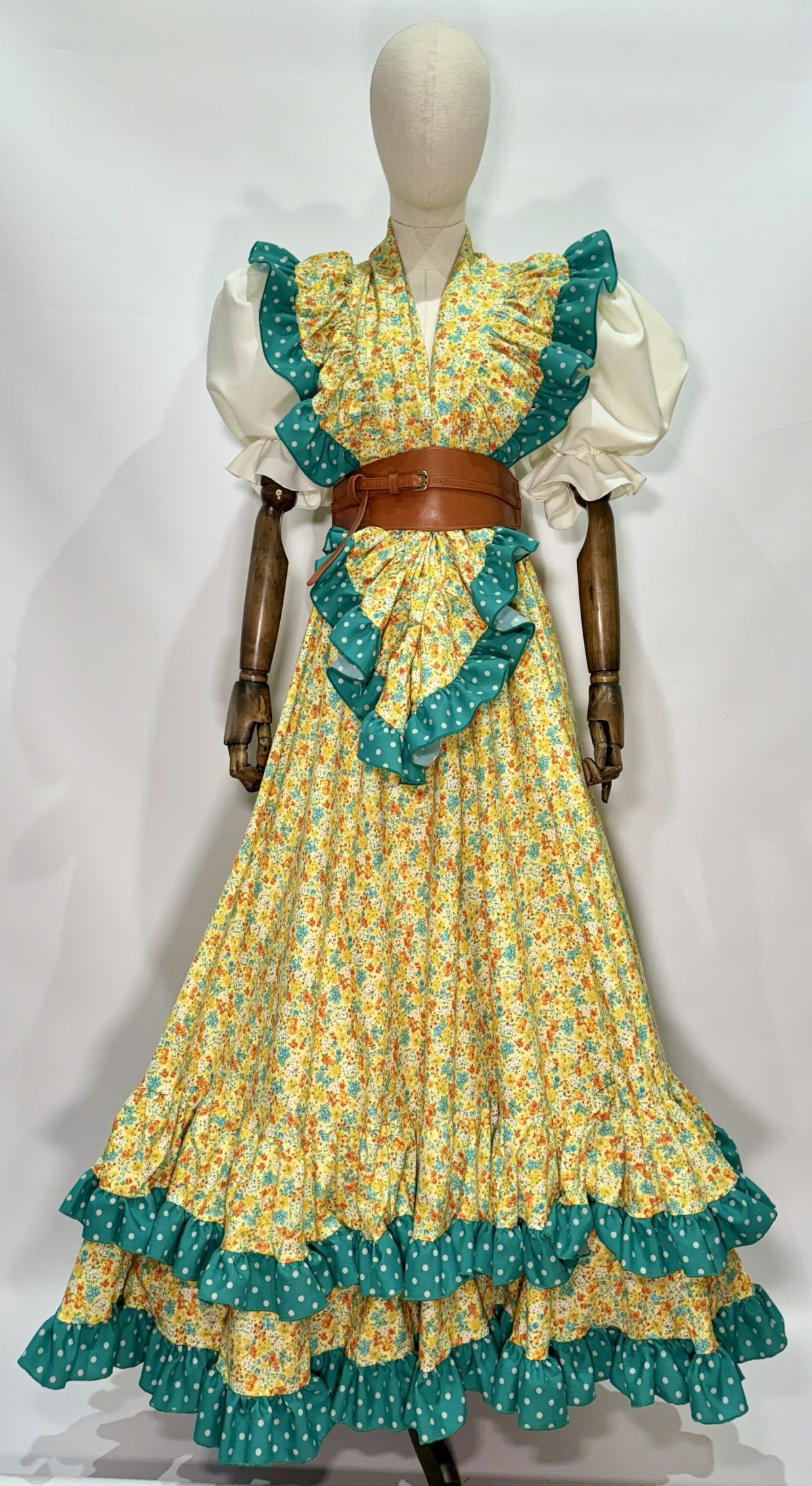 Conjunto de falda y mantoncillo a juego. Falda de capa en estampado de flores con dos volantes y volantitos verdes con lunares blancos en los bajos. Cintura elástica. Mantoncillo a juego con la falda.