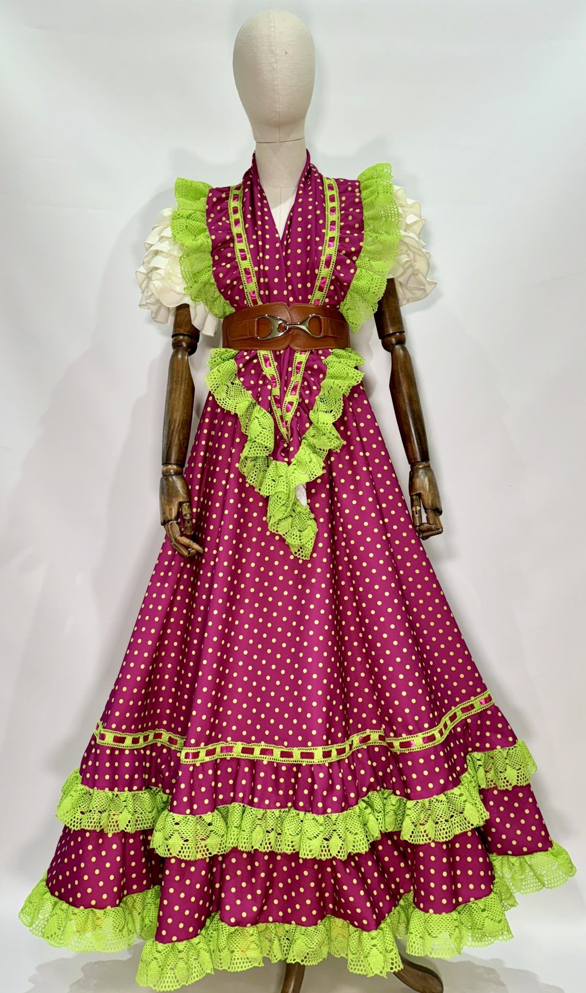 Conjunto de falda y mantoncillo a juego. Falda de capa fucsia lunares en lima de dos volantes con volantitos en los bajos de tirabordá en color lima. Pasacinta lima con lazo fucsia en la costura. Cintura elástica. Mantoncillo a juego con la falda con volantito de tirabordá lima.
