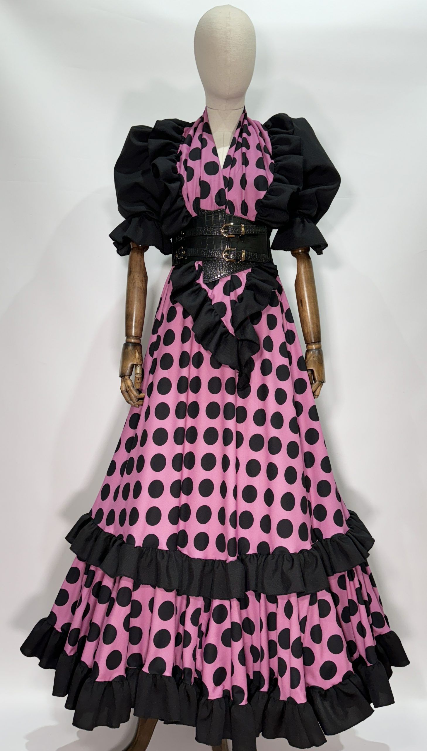 Conjunto de falda y mantoncillo a juego. Falda de capa con un volante grande, con volantito negro en la costura y en los bajos. Mantoncillo a juego con la falda.