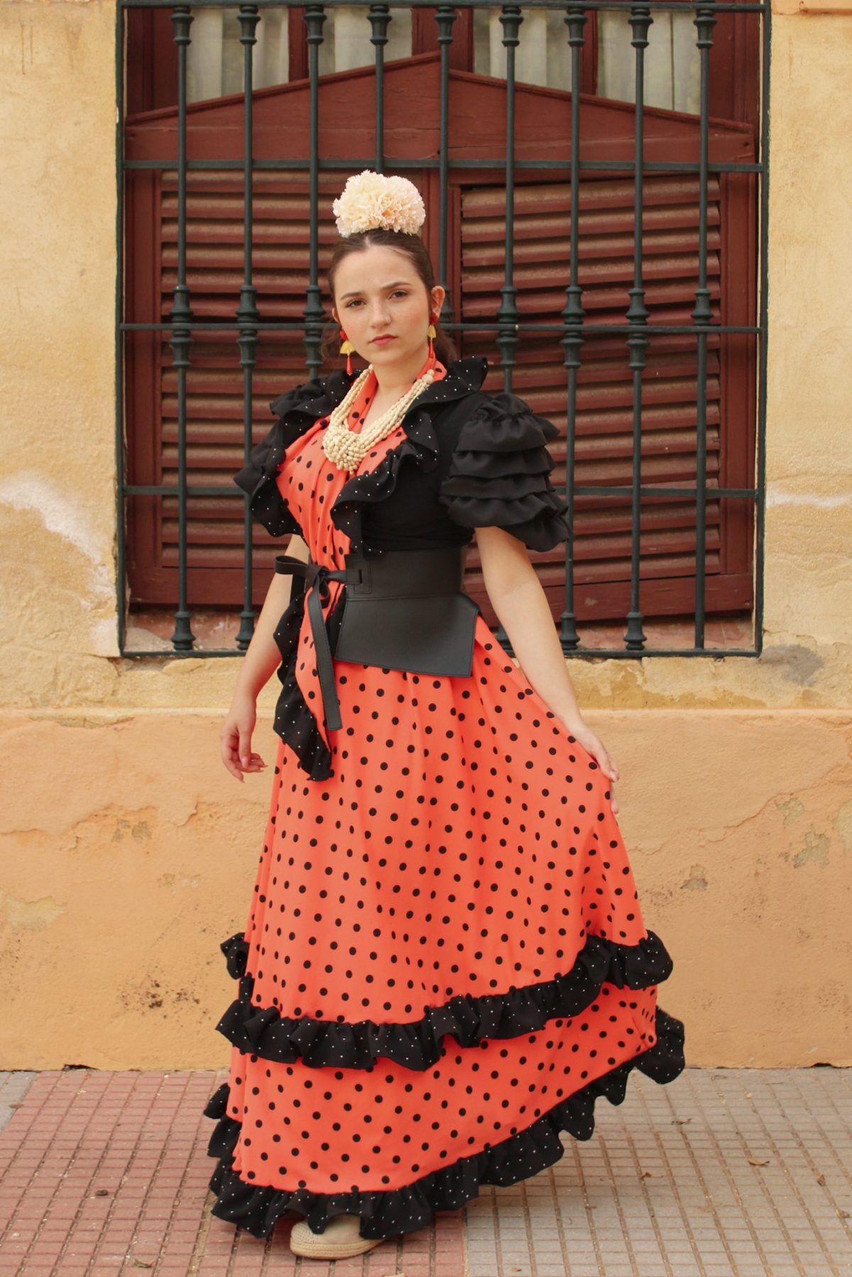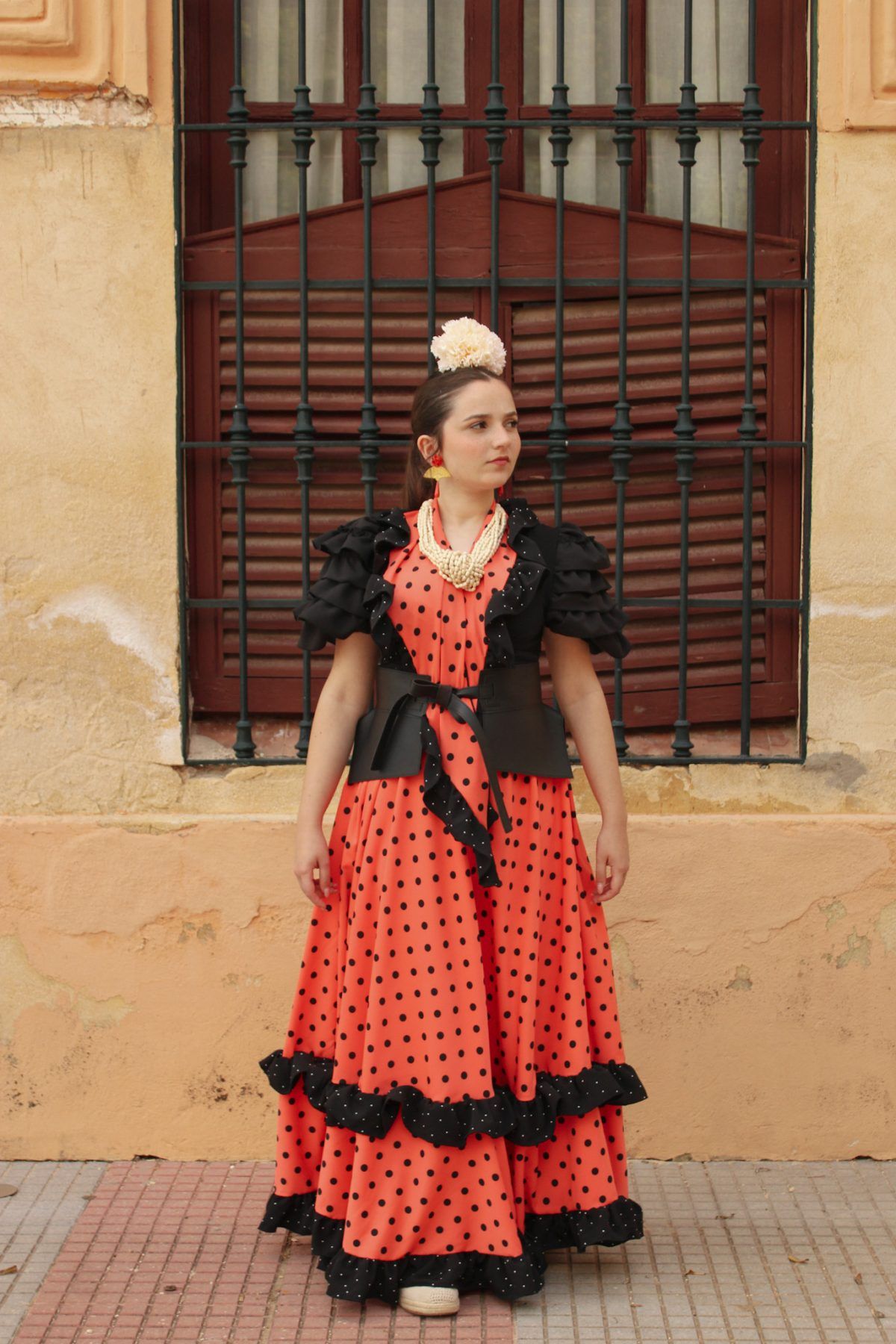 Conjunto de falda y mantoncillo a juego. Falda de capa con un volante grande y volantitos negros en la costura y en el bajo. Cintura elástica. El mantoncillo va a juego con la falda.