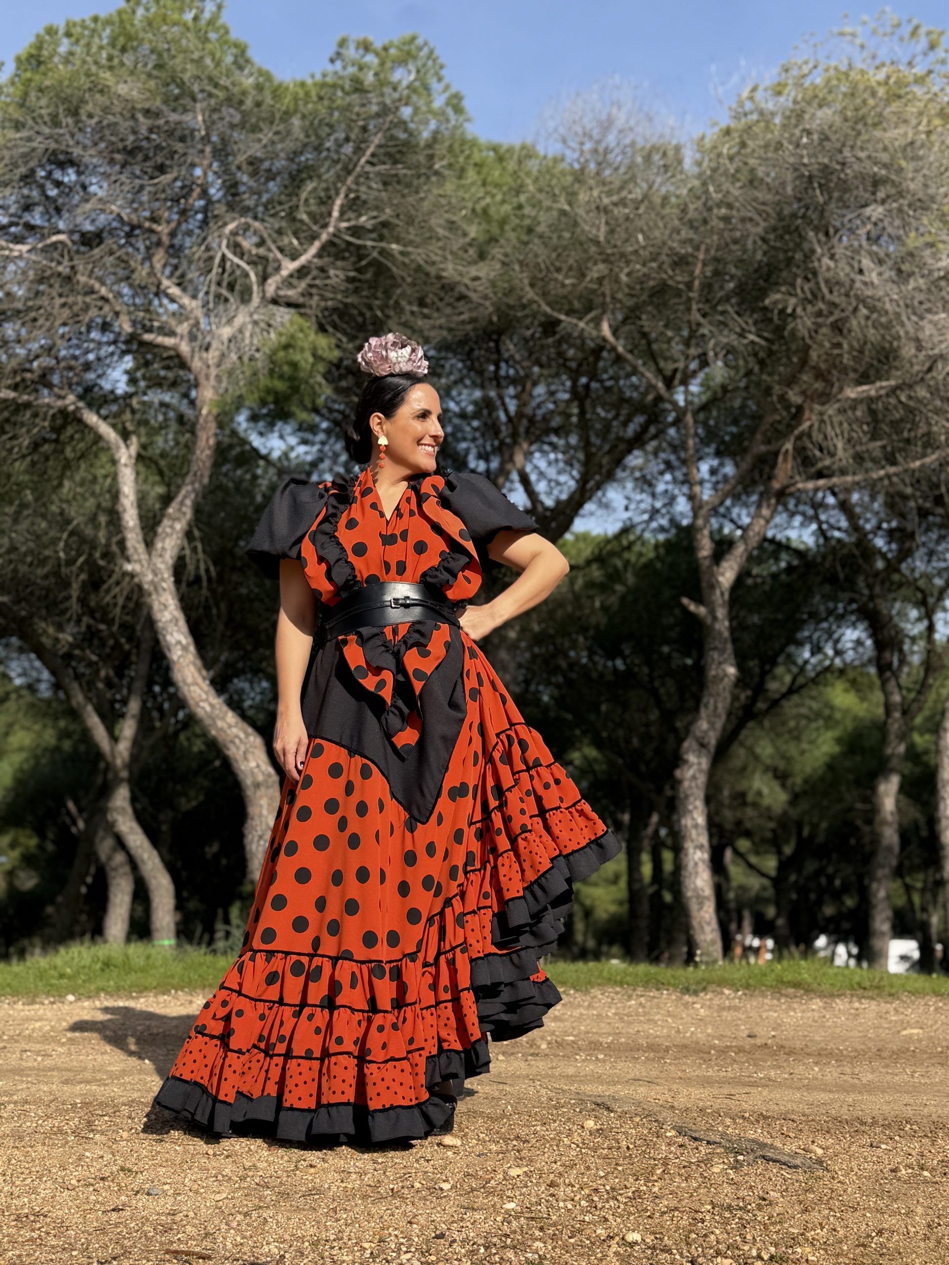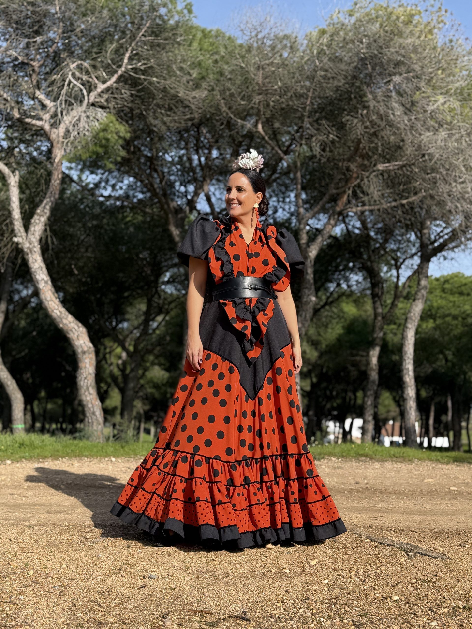 Conjunto de falda y mantoncillo a juego. Falda de capa con corte en pico negro que resalta la figura, en color caldera y lunar negro, con bajo canastero con terciopelo negro en las costuras. Cintura elástica.