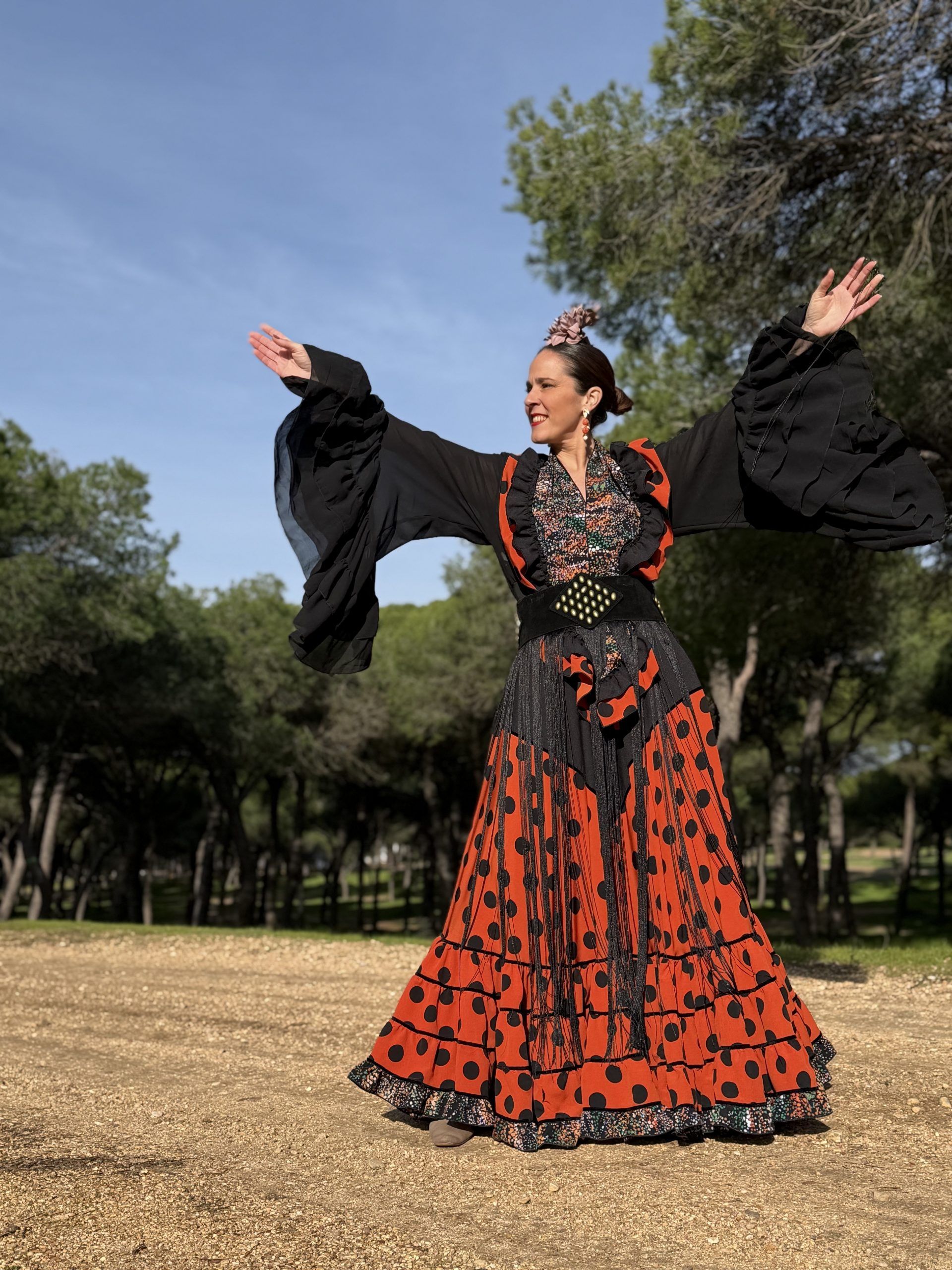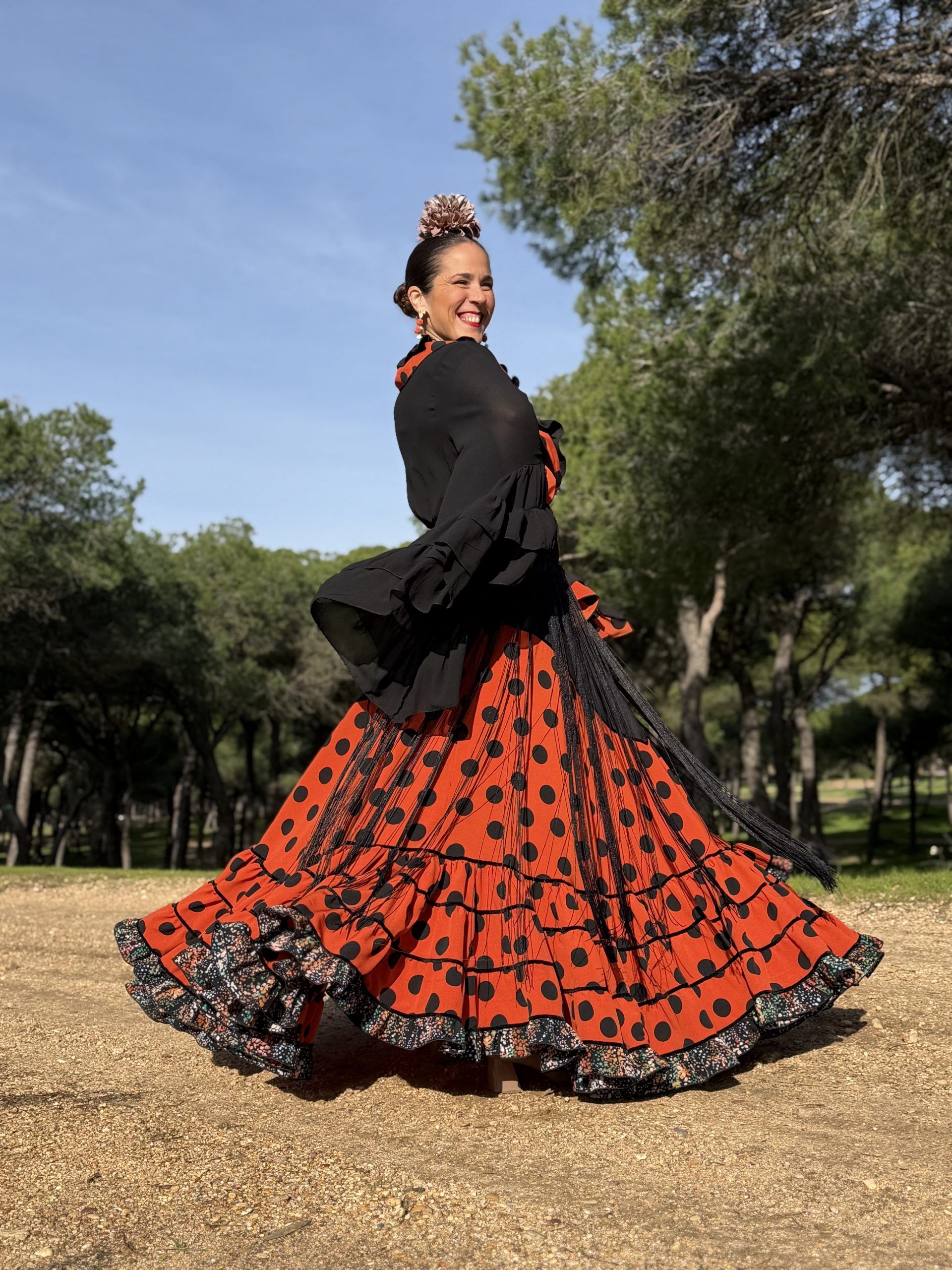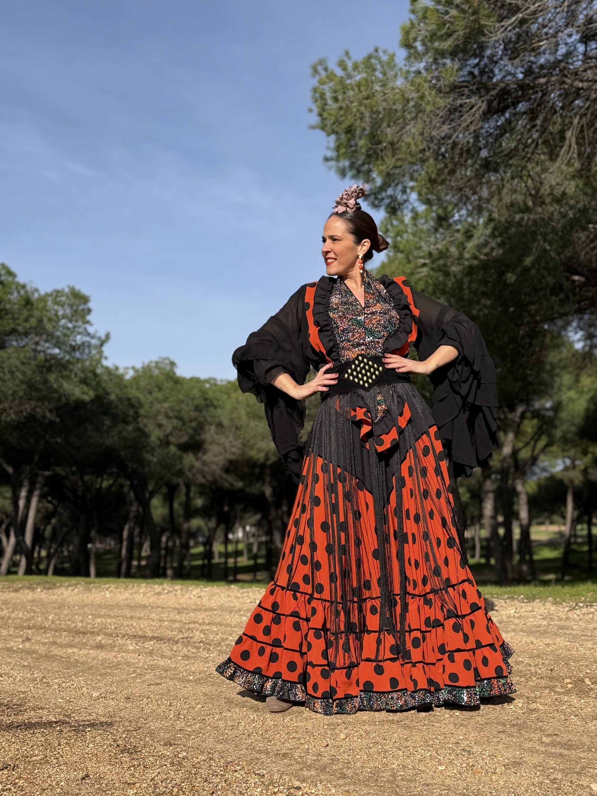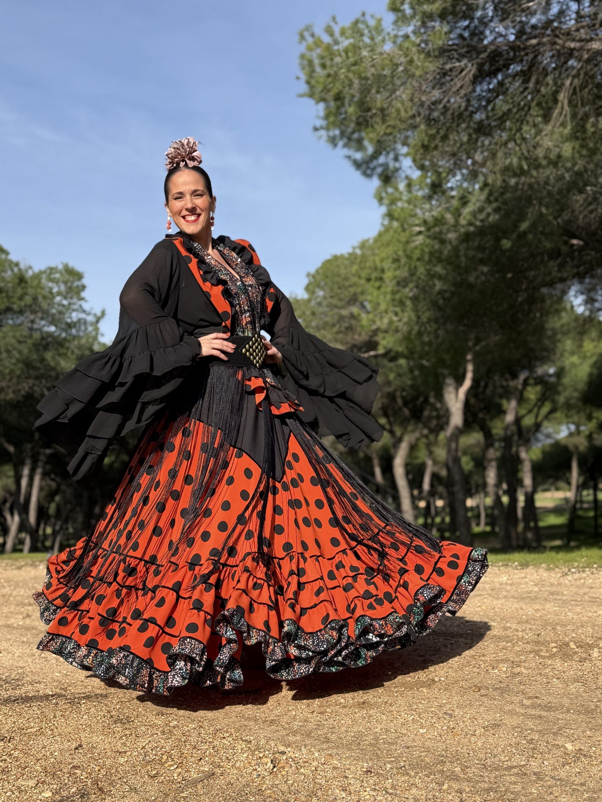 Conjunto de falda y mantoncillo a juego. Falda de capa con corte en pico negro que resalta la figura, en color caldera y lunar negro, con bajo canastero con terciopelo negro en las costuras y volantito en el bajo y el mantoncillo estampado al tono. Cintura elástica.