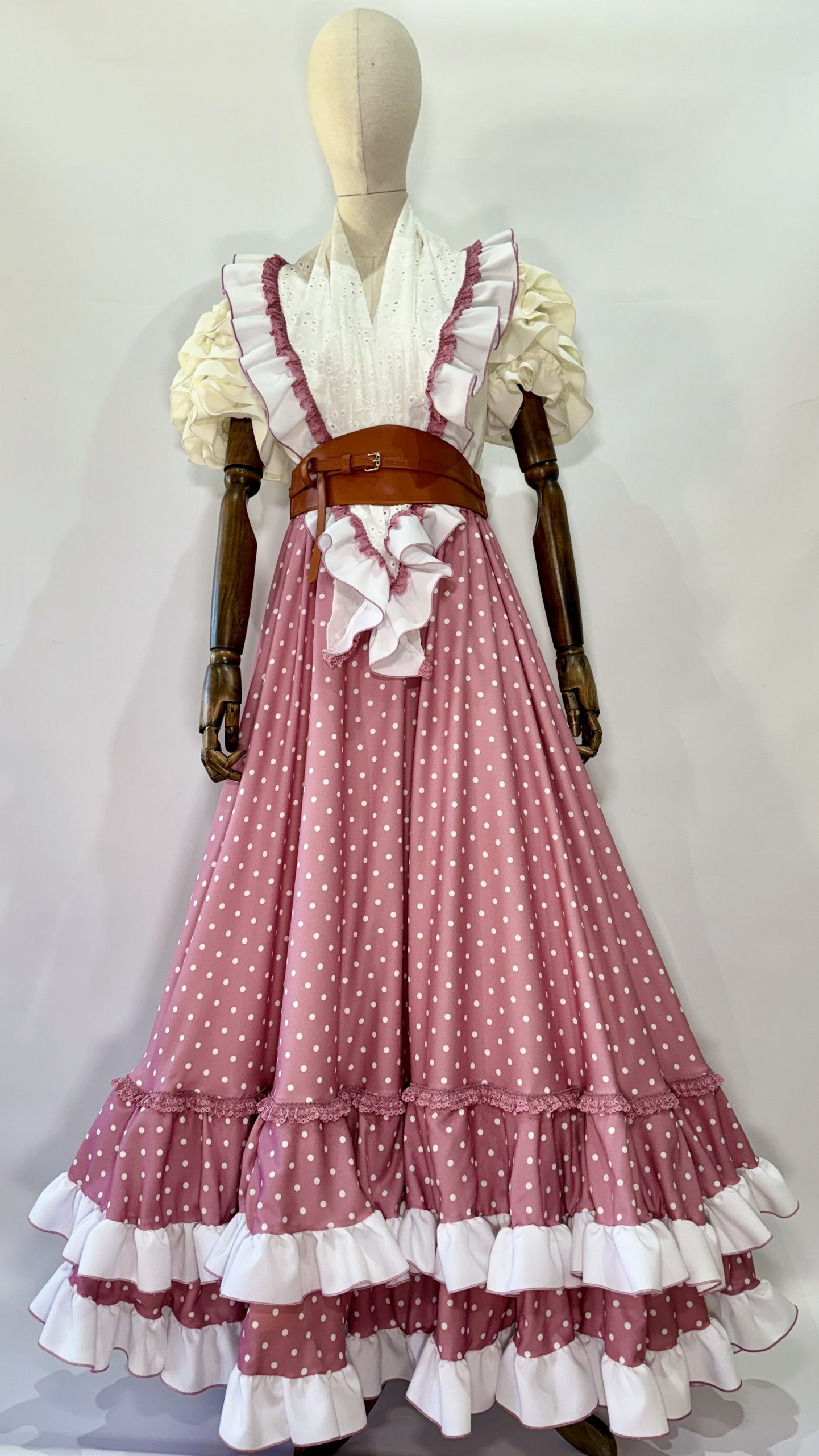 Conjunto de falda y mantoncillo a juego. Falda de capa de dos volantes con volantito blanco en los bajos con repurgo rosa. Adorno en la costura. Mantoncillo perforado con adorno en la costura y volante blanco con repurgo rosa.