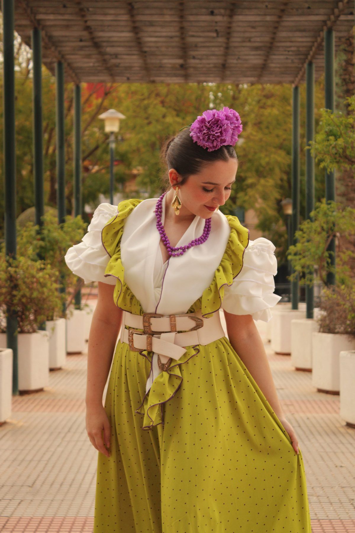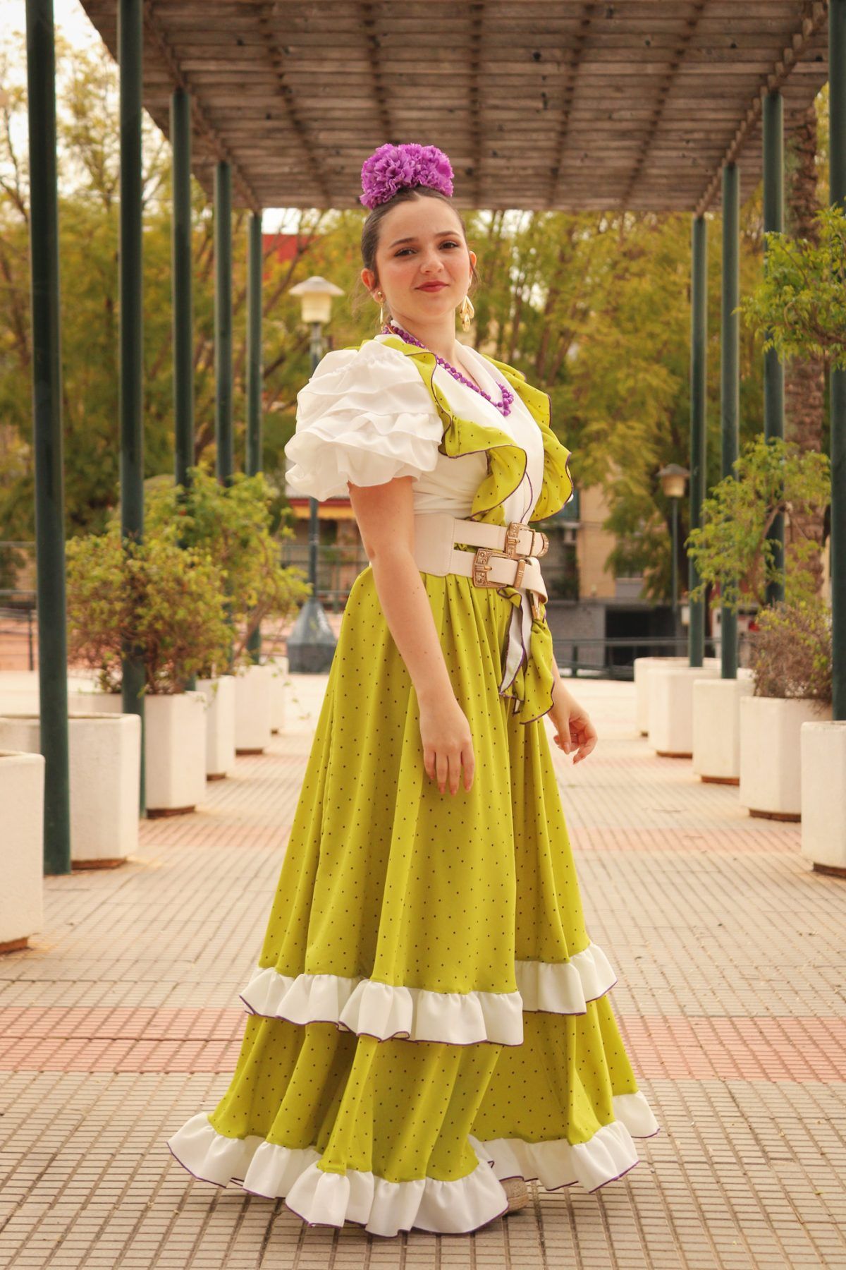 Conjunto de falda y mantoncillo a juego. Falda de capa con un volante grande y volantitos blancos en la costura y en el bajo. Cintura elástica. El mantoncillo va a juego con la falda.