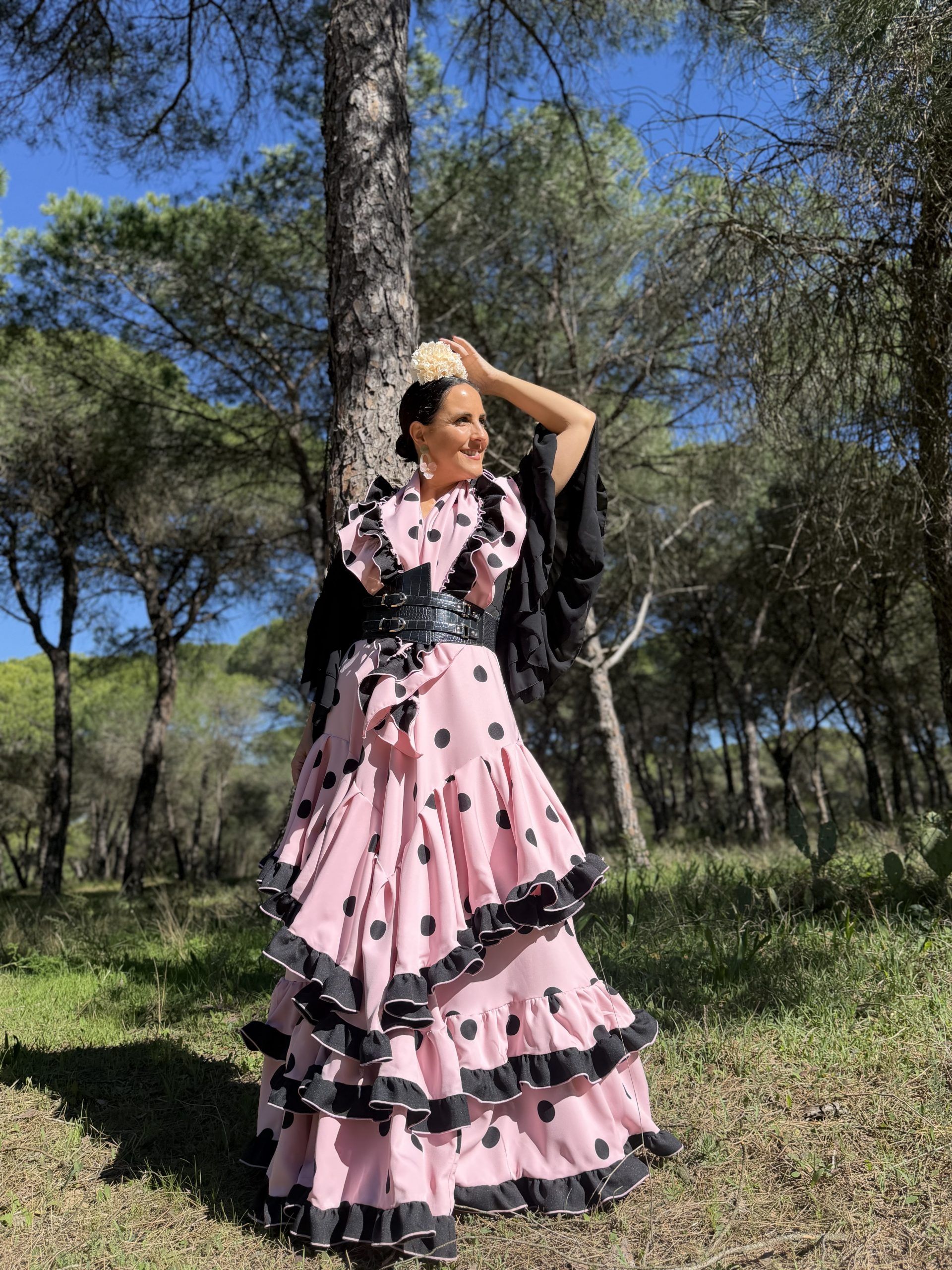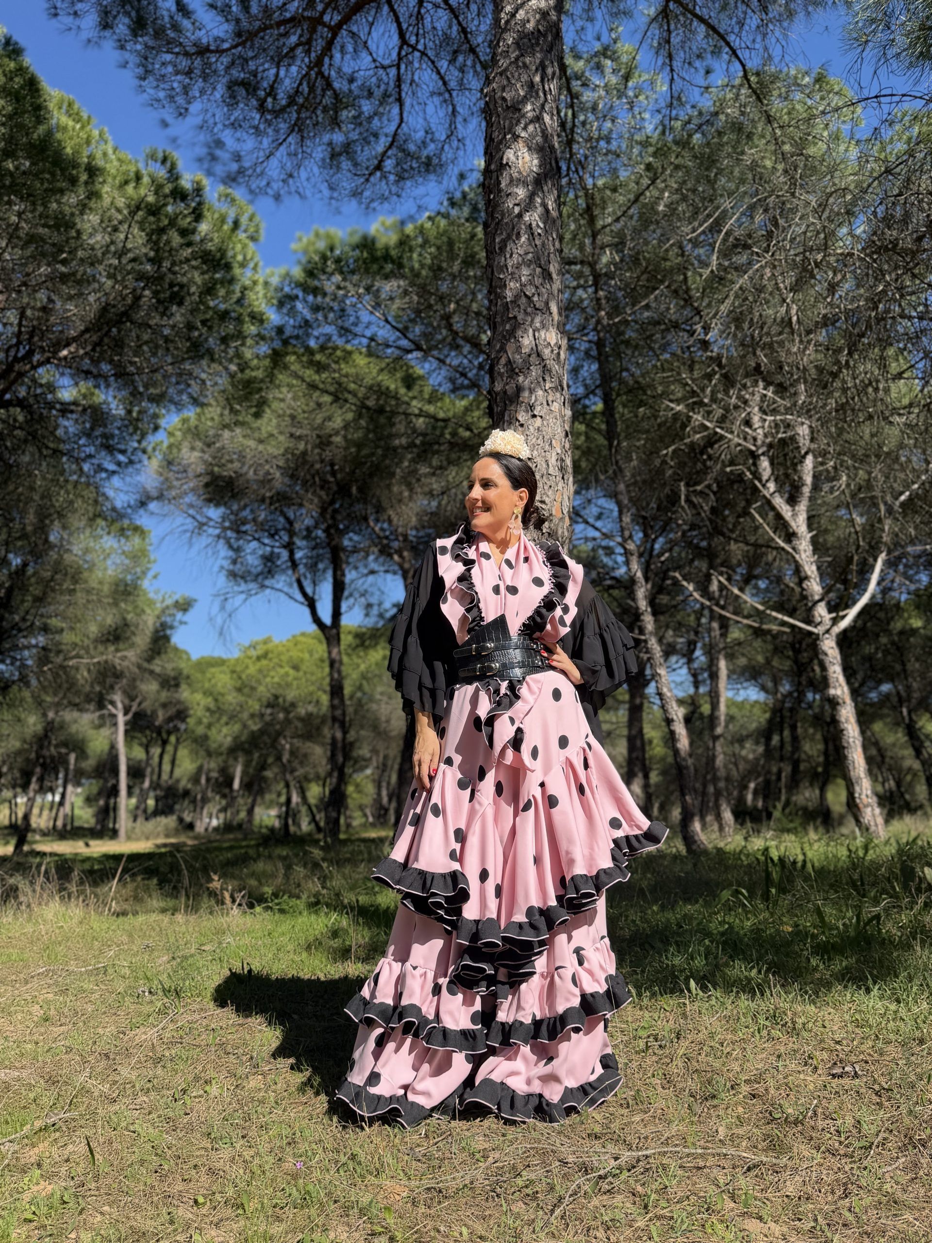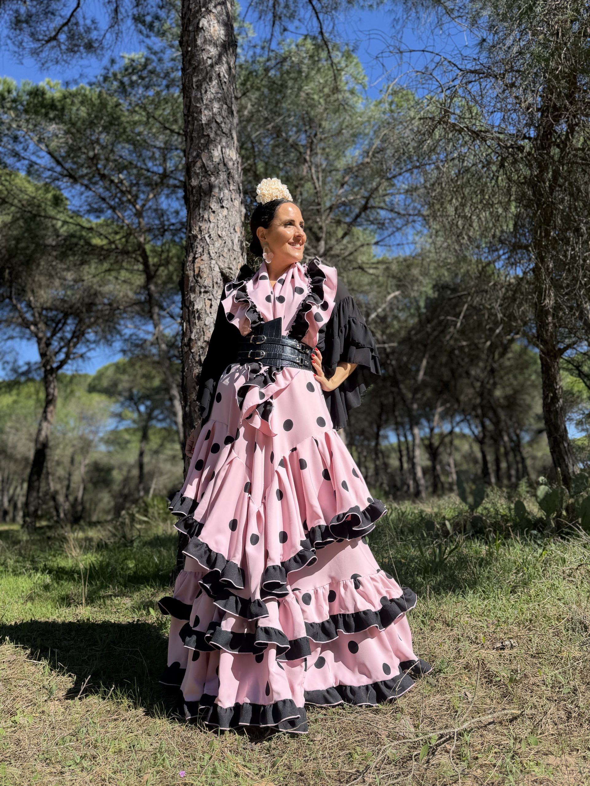 Conjunto de falda y mantoncillo a juego. Falda de capa con dos volantes en el bajo y un tercer volante en forma de V en la falda. Mantoncillo a juego con la falda. Cintura elástica.