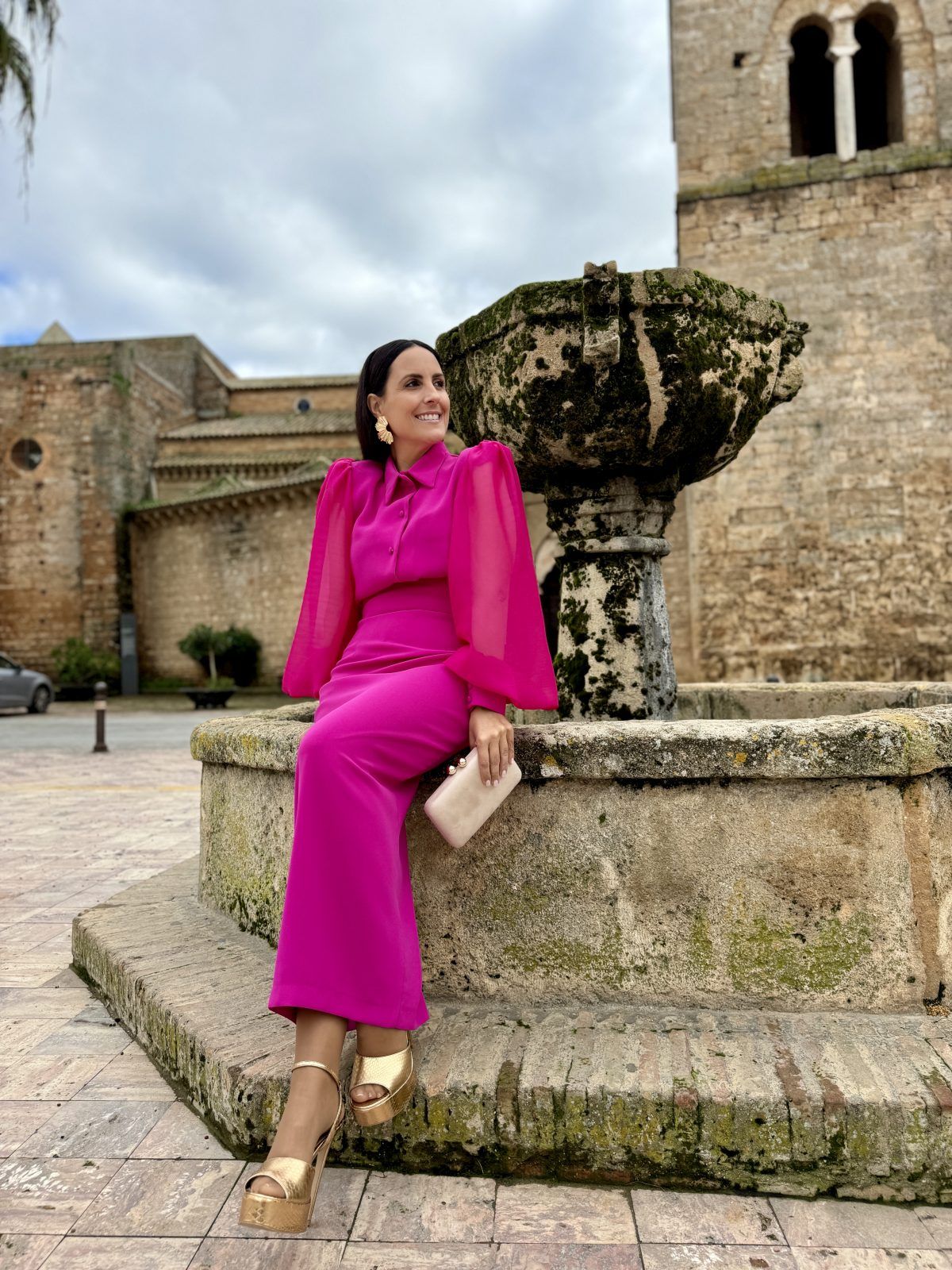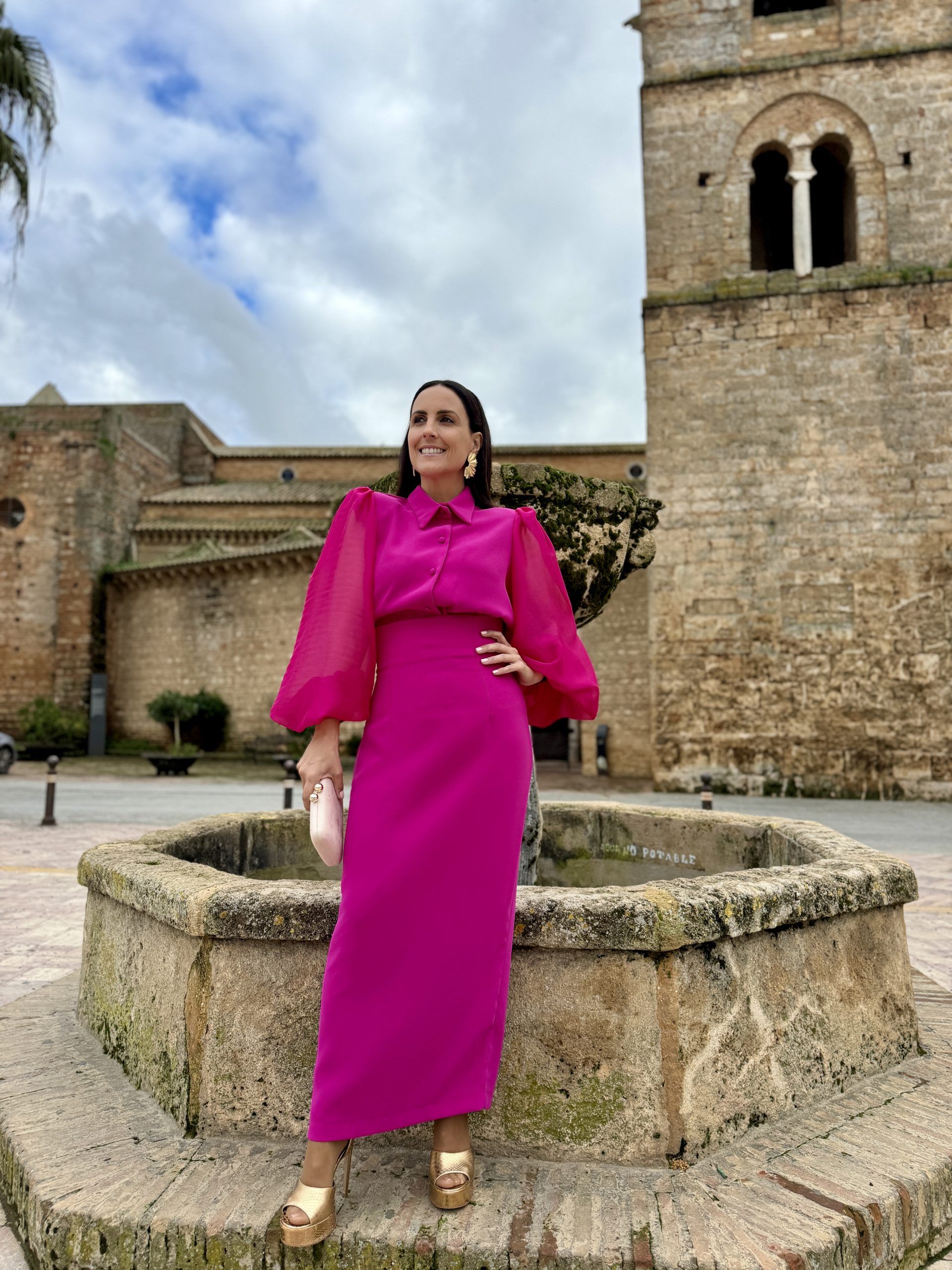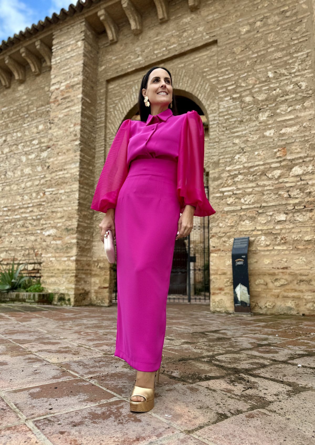 Conjunto de dos piezas en color fucsia compuesto por camisa de gasa con manga abullonada y botones en el puño, y por falda recta de cintura alta y abertura trasera.