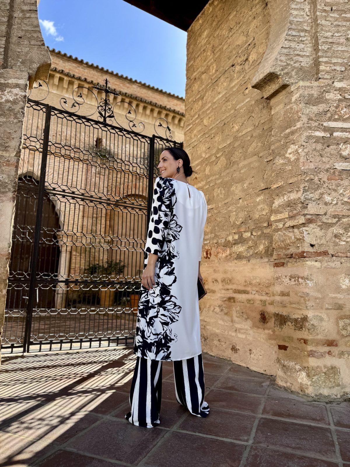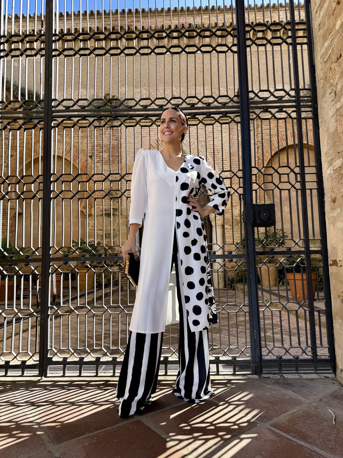 Conjunto compuesto por dos piezas, túnica de escote de pico y manga francesa con abertura delantera. Pantalón ancho con cintura engomada en la parte trasera.