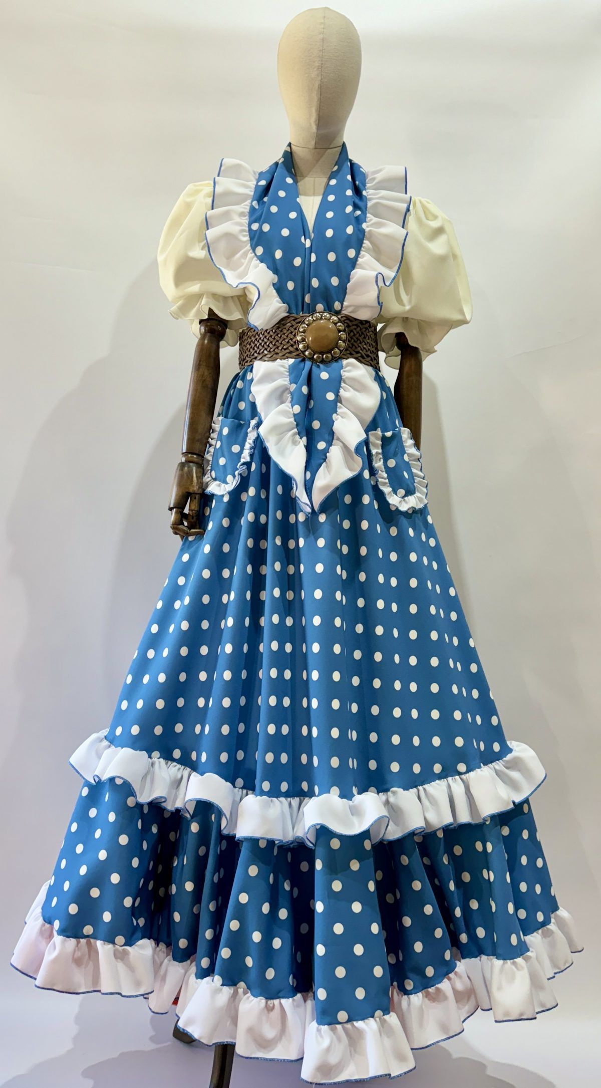 Conjunto de falda y mantoncillo a juego. Falda de capa con un volante grande y volantitos blancos en la costura y en el bajo con repurgo azul. Cintura elástica y dos bolsillos delanteros. El mantoncillo lleva volante blanco con repurgo azul.