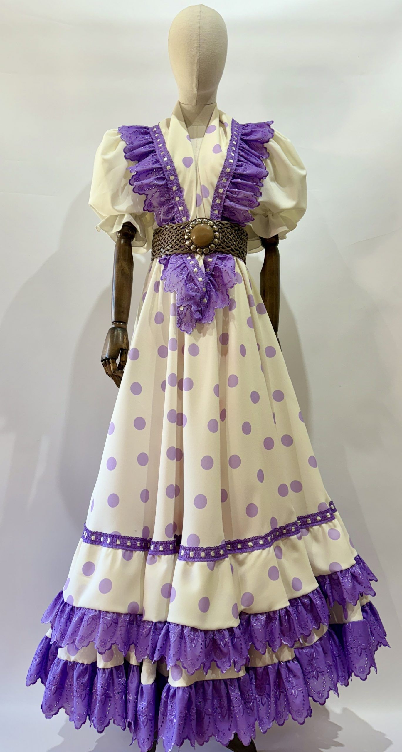 Conjunto de falda y mantoncillo a juego. Falda de capa con dos volantes con tirabordá malva en los bajos y pasacinta malva en la costura con lazo beige. Cintura elástica. El mantoncillo lleva volante de tirabordá malva y pasacinta malva con lazo beige.