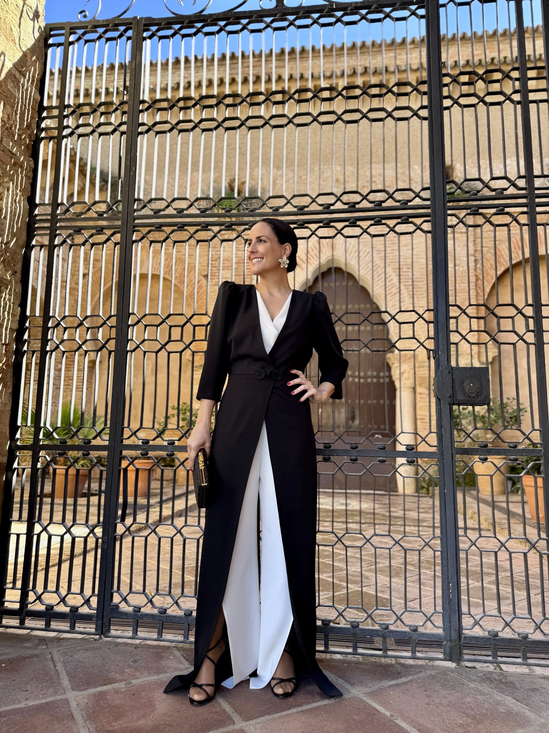 Mono con escote de pico y manga francesa. Apertura en los bajos de los pantalones.