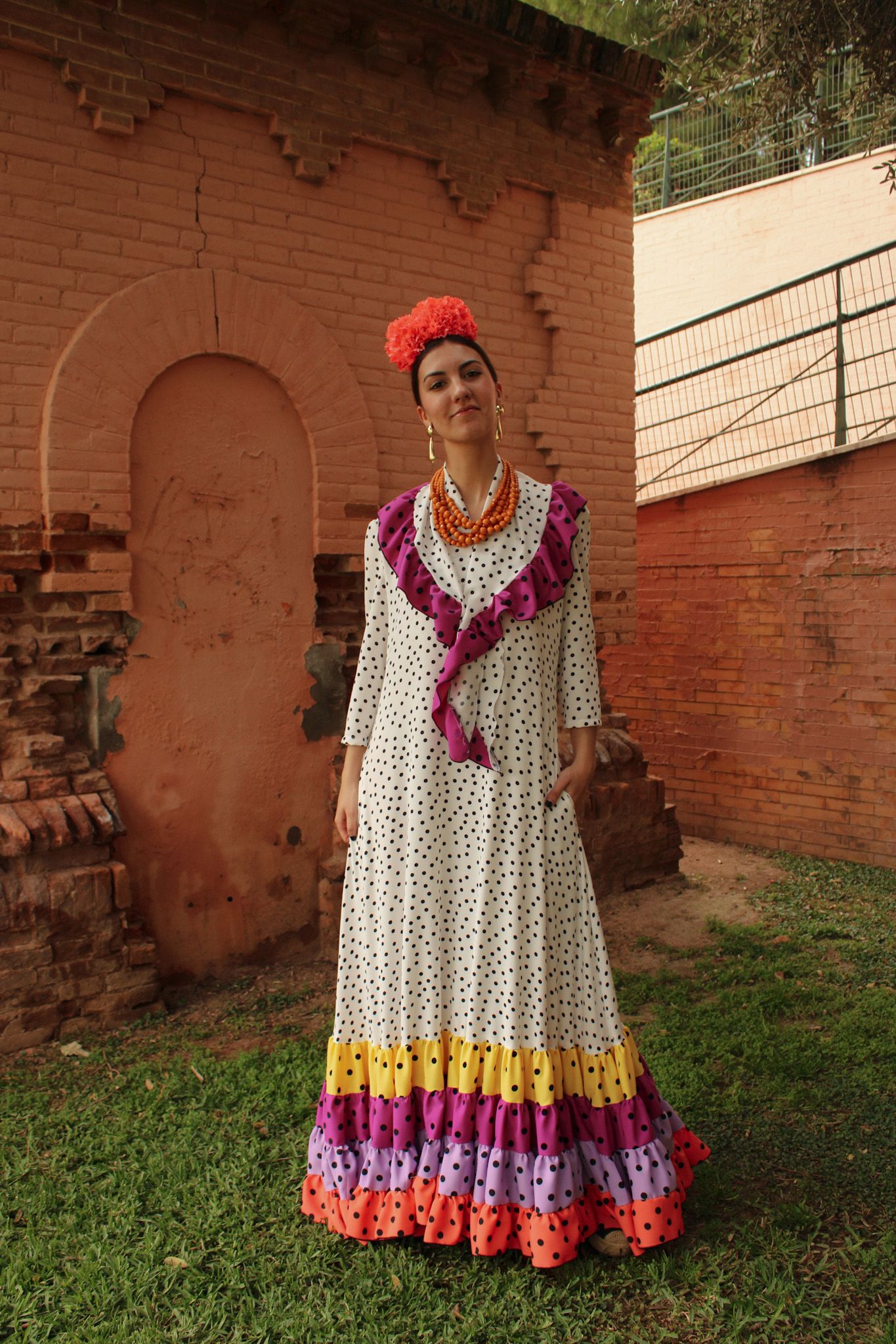 Bata rociera con volantes canasteros de colores en el bajo. Mantoncillo a juego con el vestido.