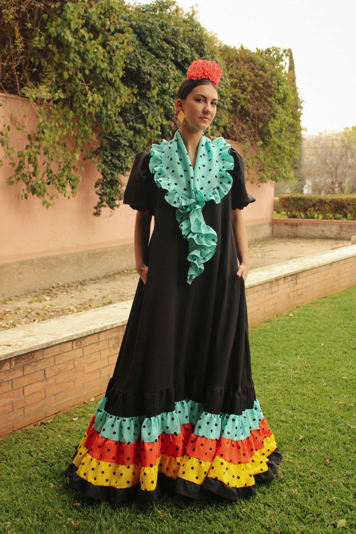 Bata rociera con volantes canasteros de colores en el bajo. Mantoncillo a juego con el vestido.