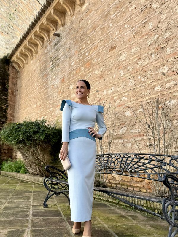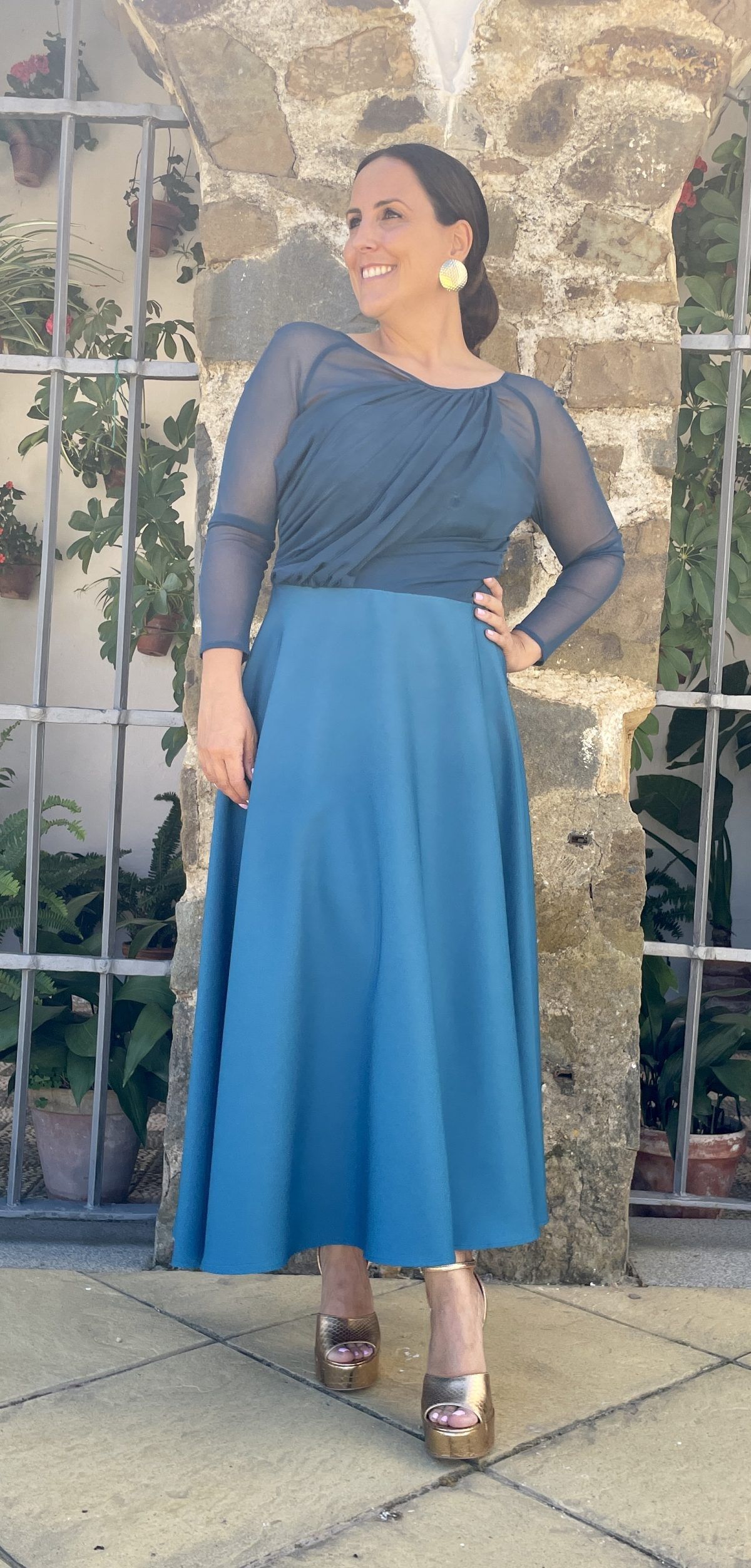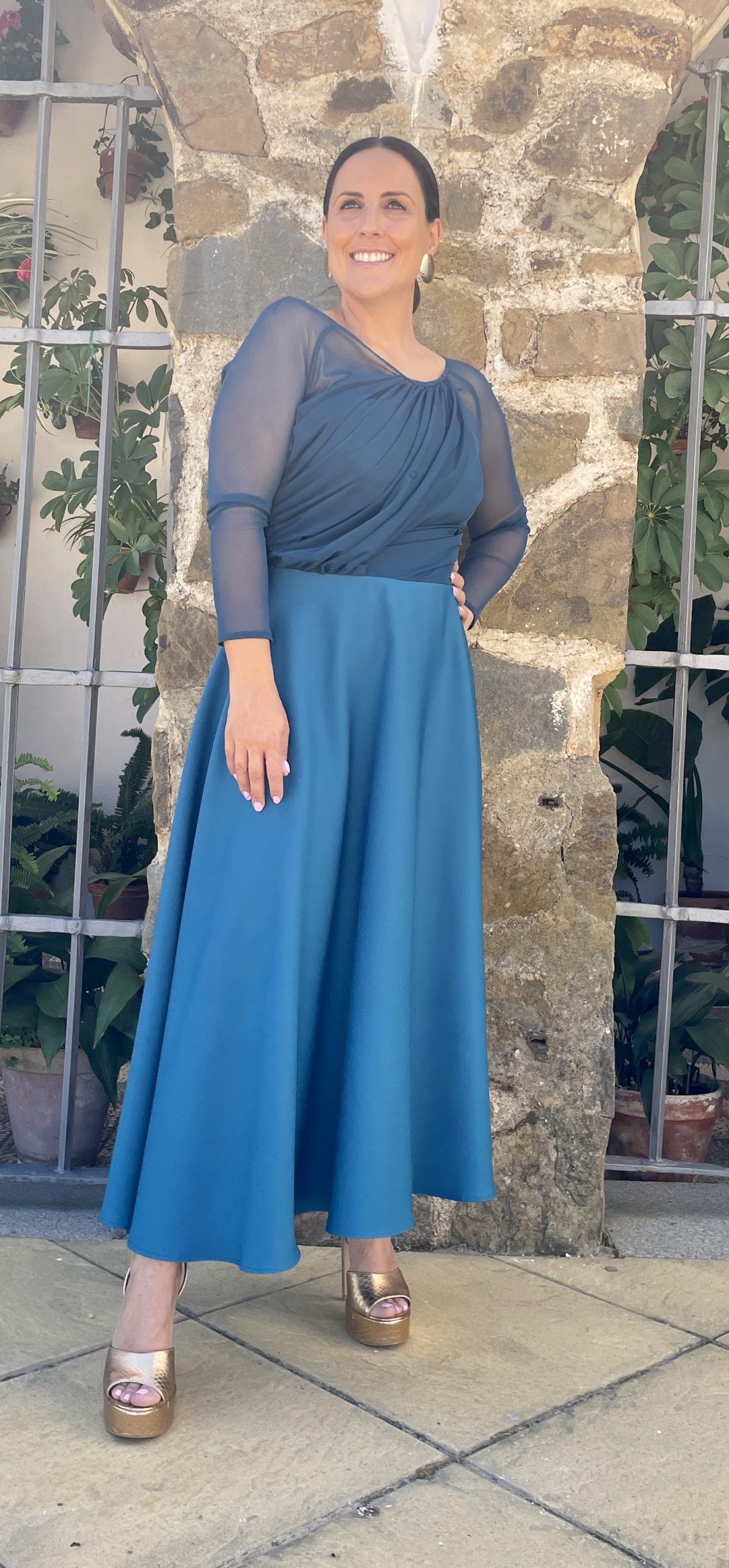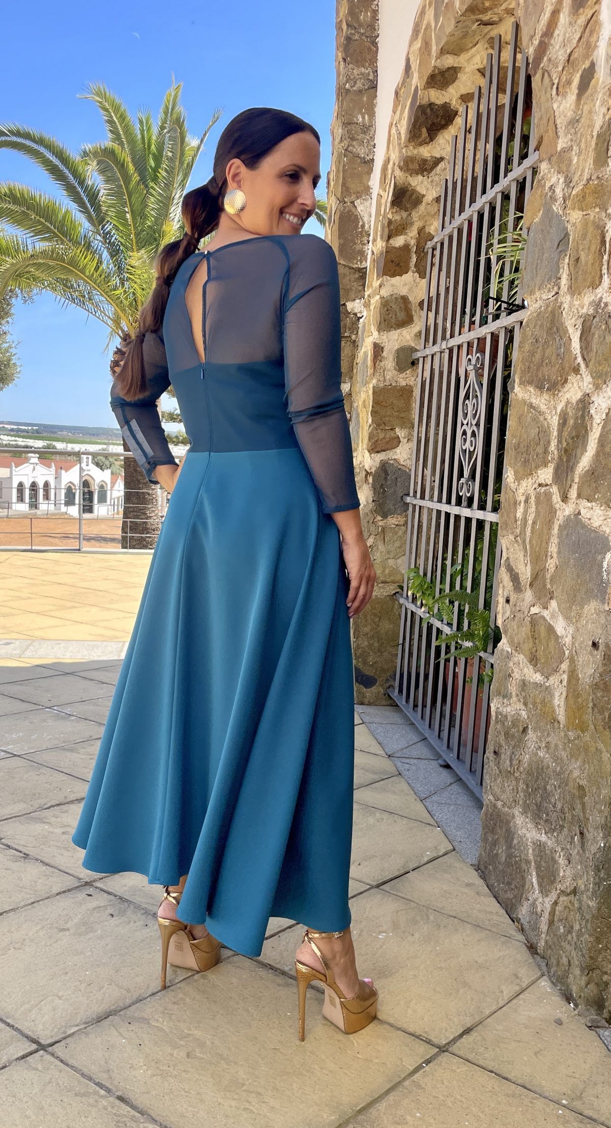 Vestido de cóctel midi cortado a la cintura, elegante y femenino, con corte fluído, falda en forma de A, manga de tul y precioso escote, para darle un aire elegante, sofisticado y muy favorecedor.