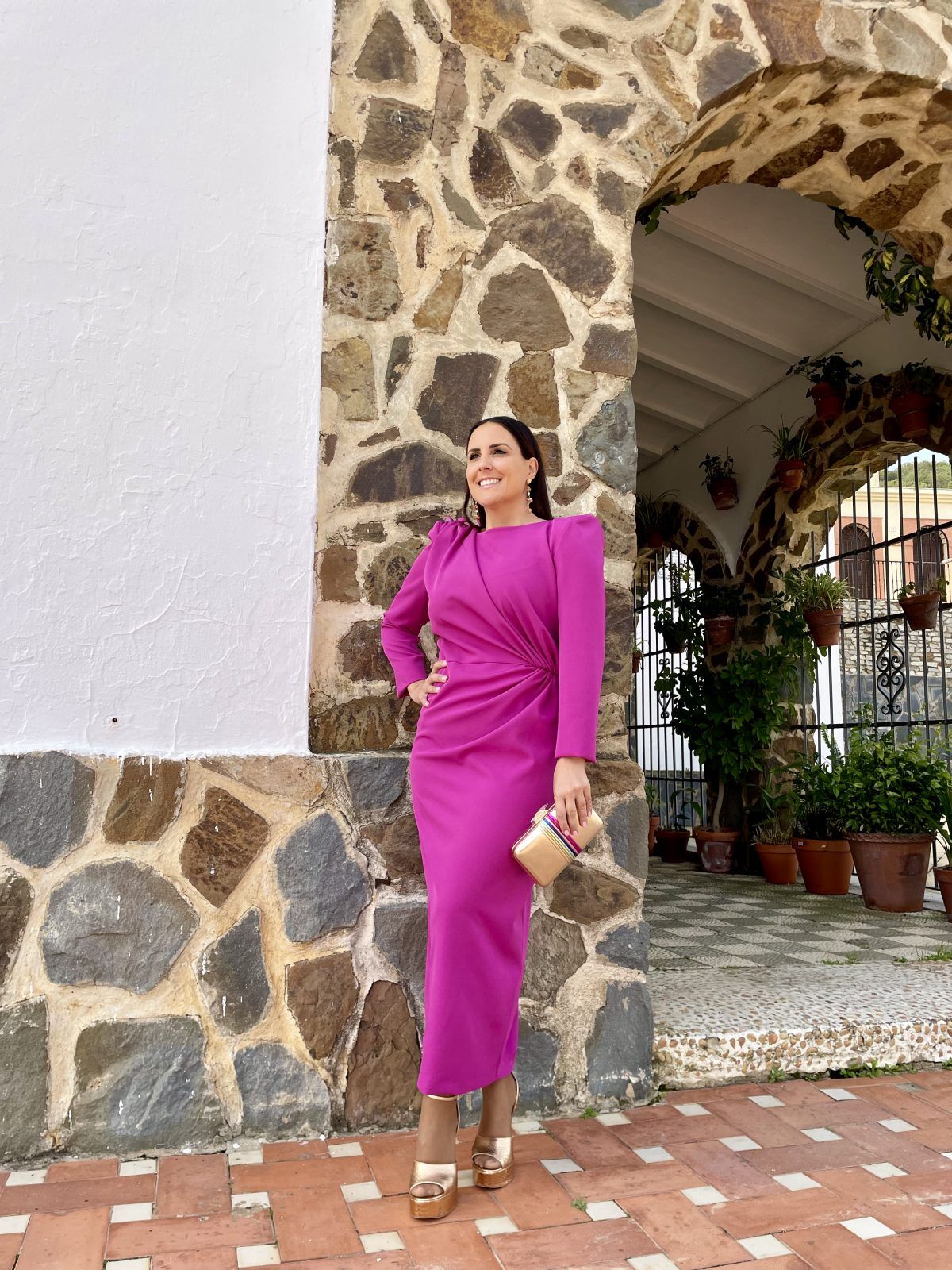 Vestido midi confeccionado en crep con elastano que lo convierte en un vestido ajustable que se adapta a todo tipo de cuerpos. Fruncido en la cintura tiene un drapeado lateral y el hombro derecho tiene botones forrados al tono. Raja trasera.