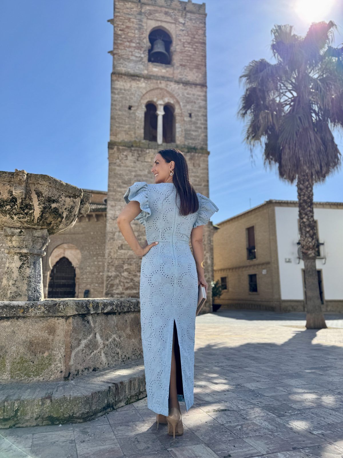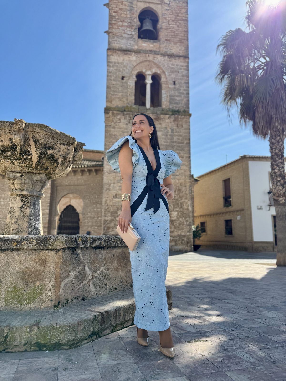 Vestido midi de tejido perforado con escote de pico, mangas semiabullonadas y lazo delantero.