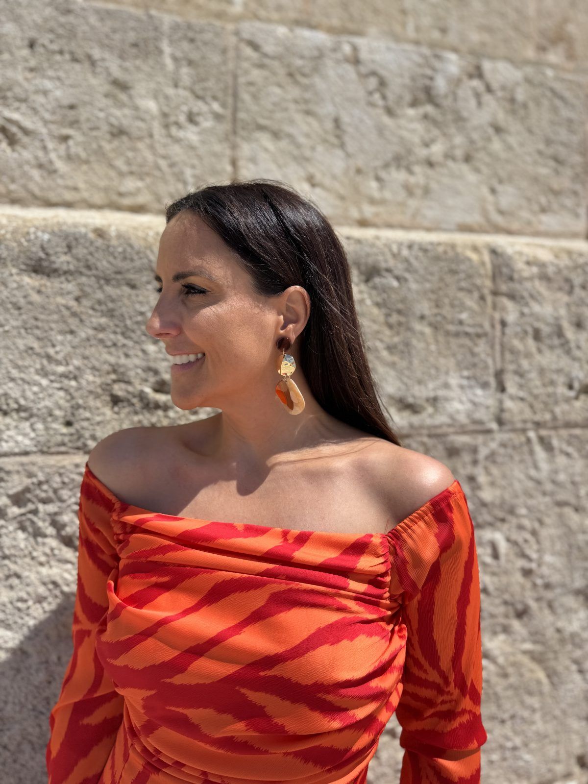 Vestido largo en tejido satén fluido de color coral estampado forrado al tono. El toque de distinción lo marca la asimetría del escote con los hombros fuera, la raja lateralizada y el drapeado por todo el cuerpo. Es un diseño espectacular diseñado para que arrases en tu evento.