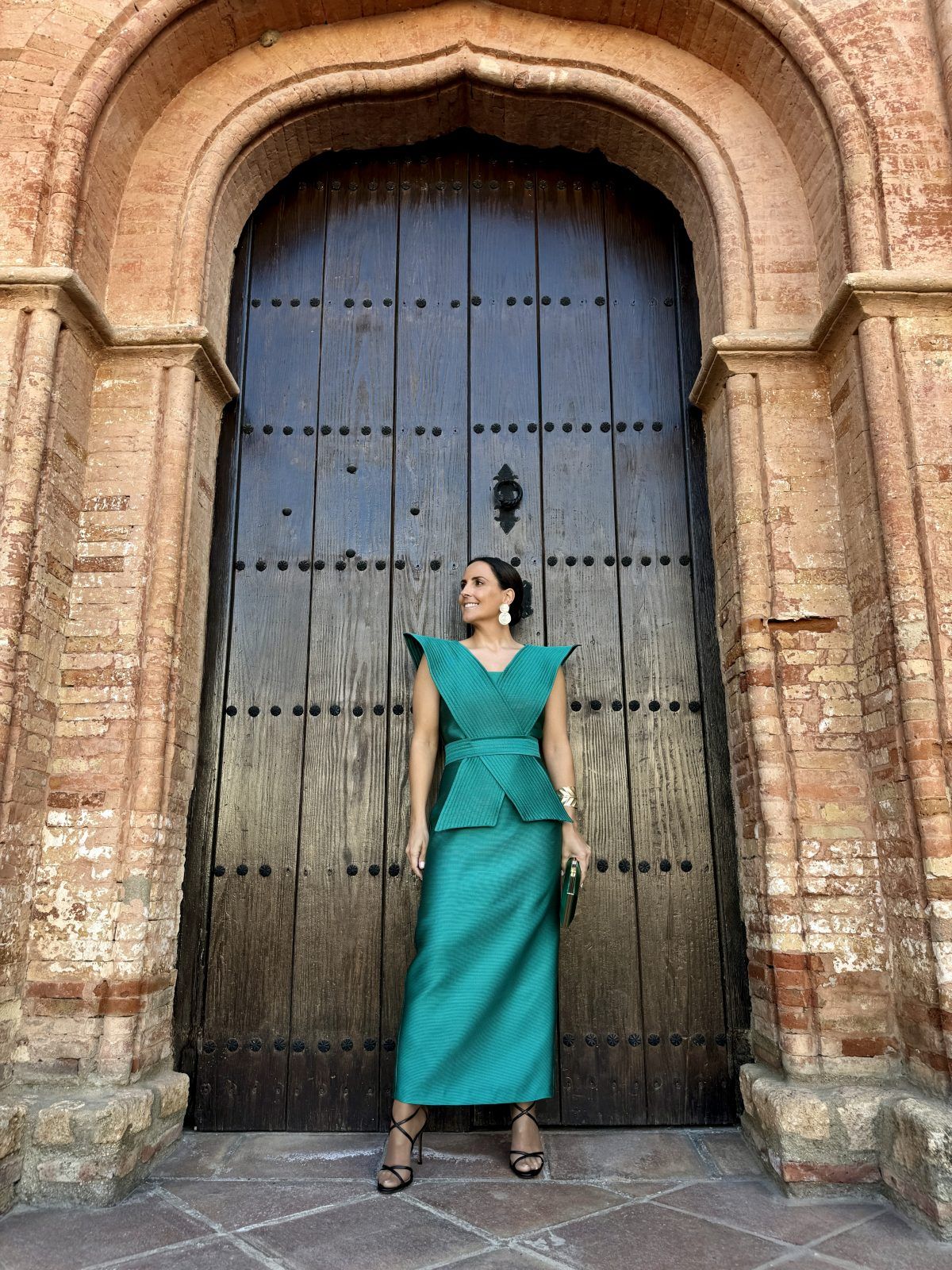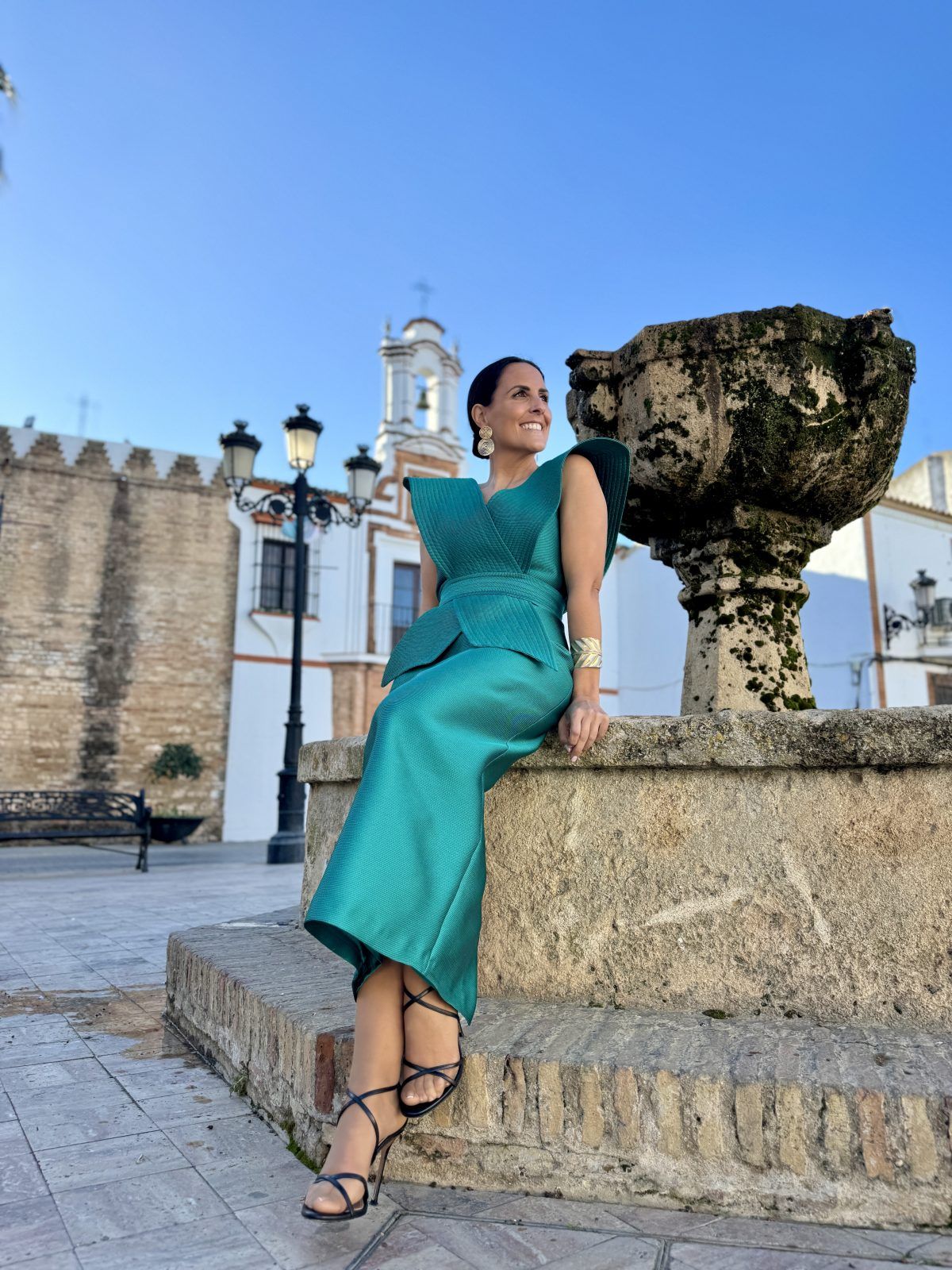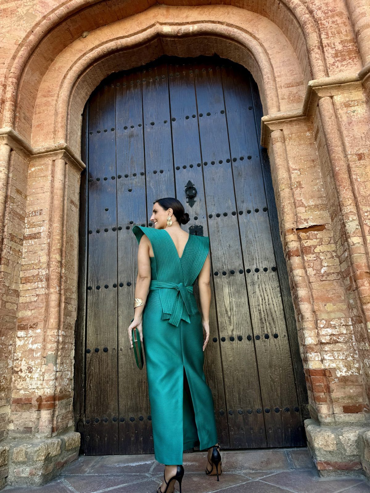 Vestido midi verde confeccionado en tejido jacquard, falda lápiz y solapas cruzadas en el pecho con cinturón.