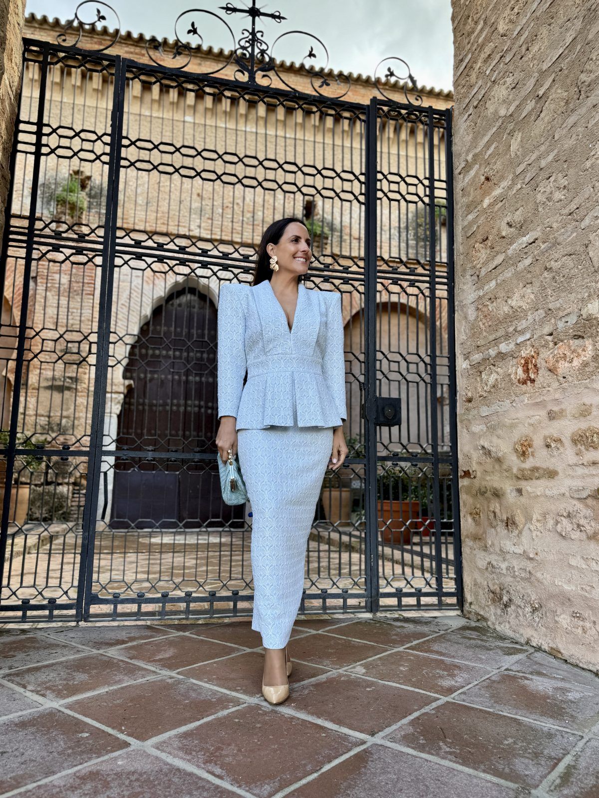 Vestido confeccionado en un elegante tejido de jacquard deboré con detalles de hilo metalizado en color dorado. Con un favorecedor escote estilo smoking en forma de «V», lleva hombreras estructuradas. La falda cuenta con un pemplum. Totalmente forrado en viscosa, esta pieza ofrece un estilo único y sofisticado.