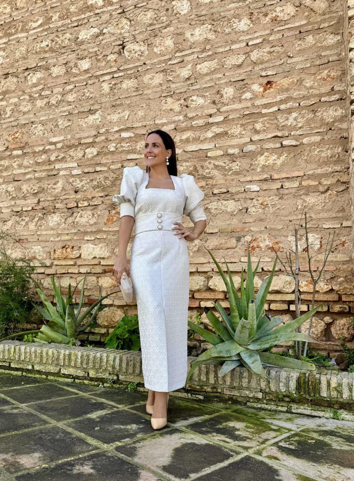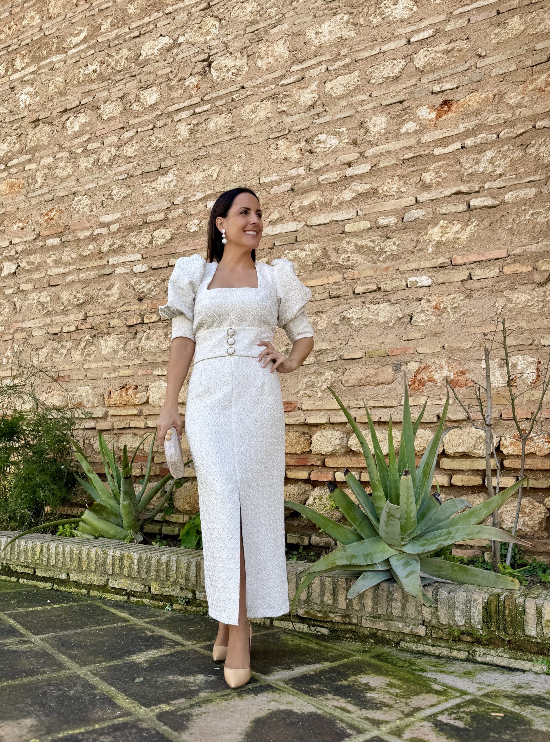 El cuerpo lleva escote cuadrado, manga globo y diseño ,con volumen muy favorecedora. En la cintura cuenta con un pequeño fajín, botones joya y vivo.