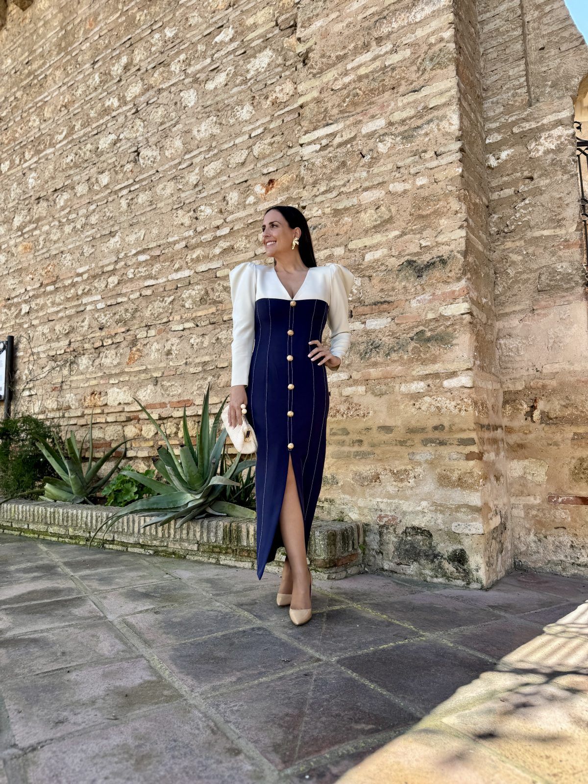 Vestido midi bicolor efecto vaquero con escote de pico, mangas abullonadas y botones delanteros.