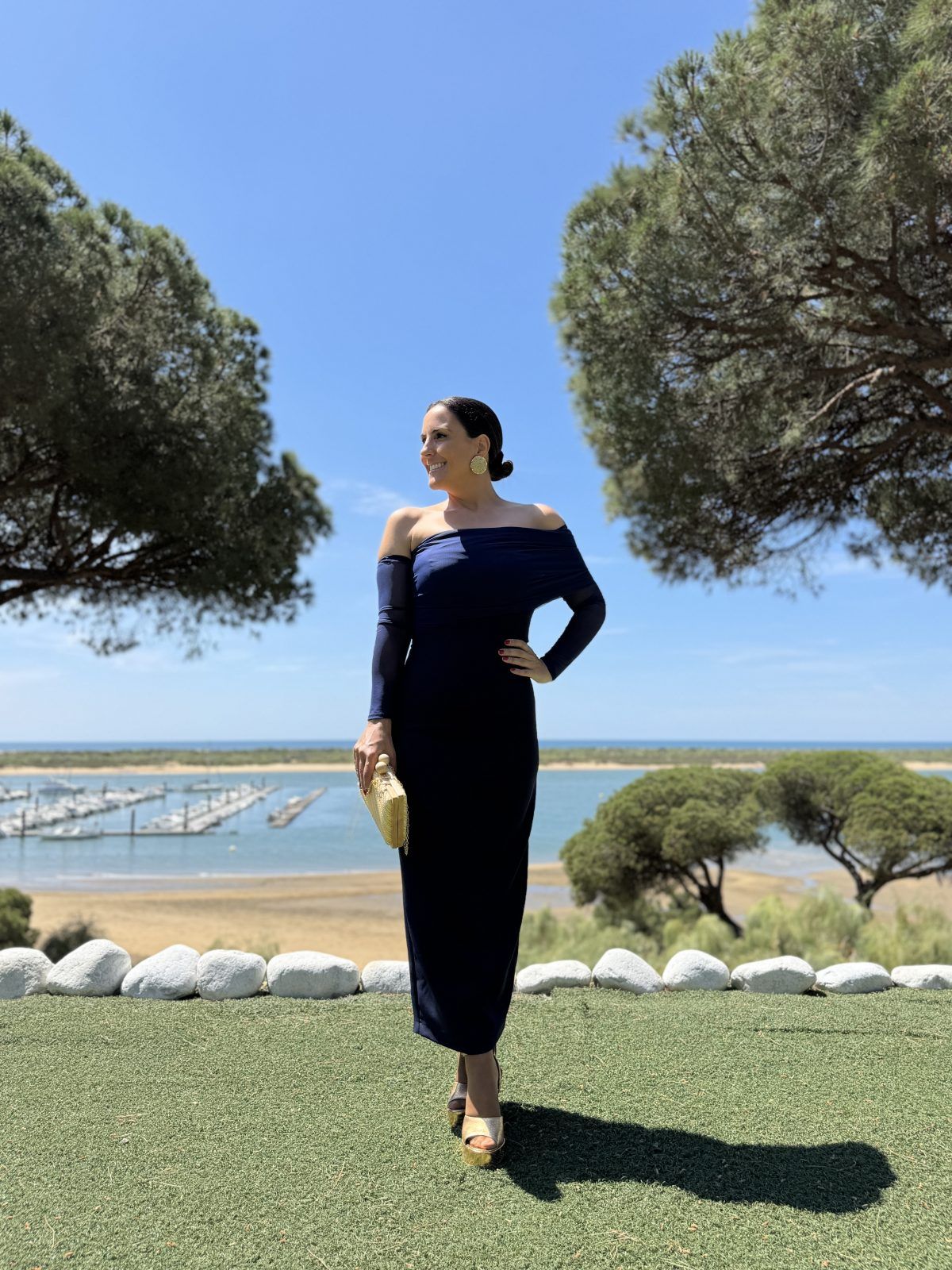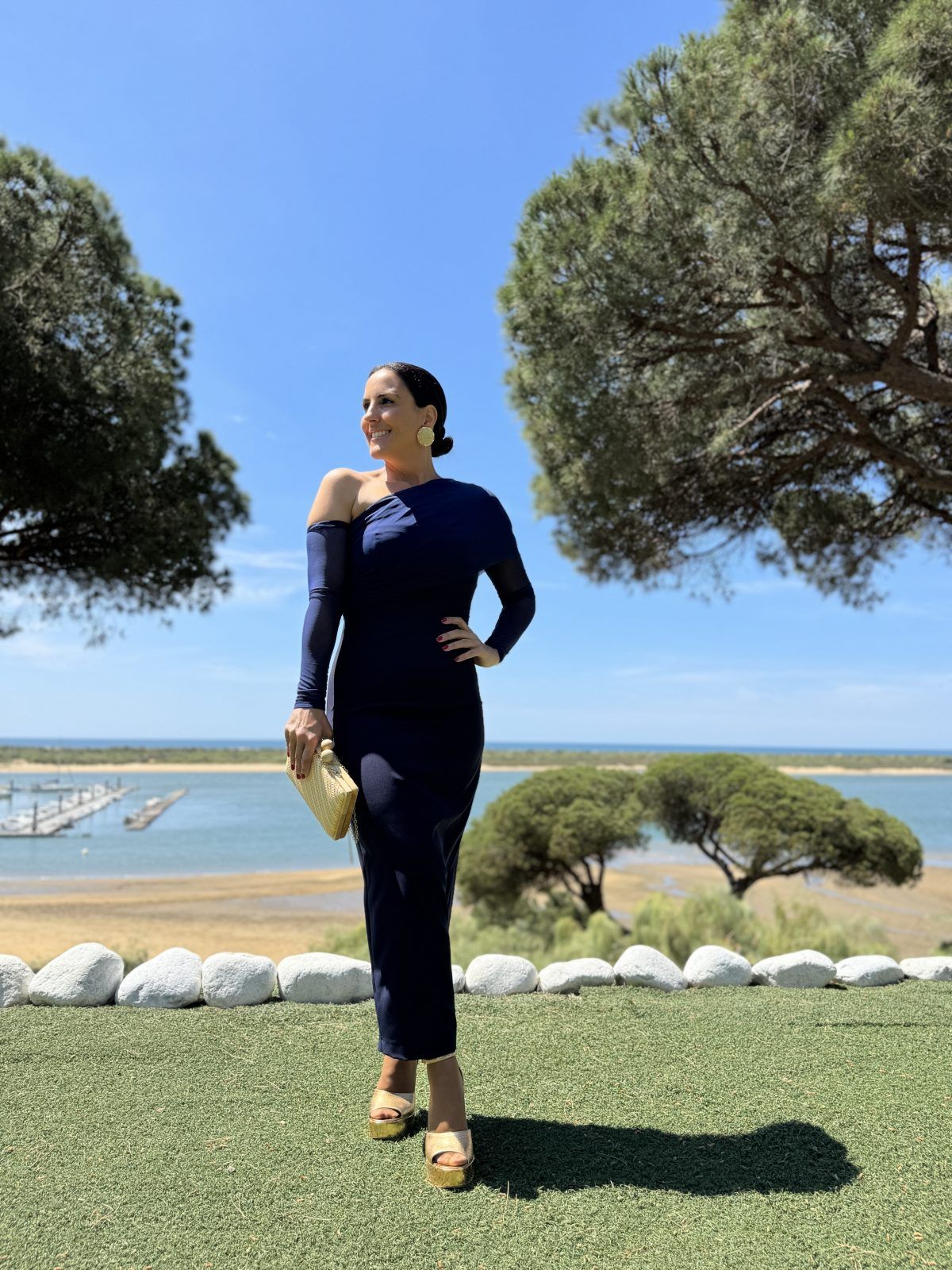 Vestido midi en tejido crepe bioelástico forrado al tono de color azul marino. El toque de distinción lo marca la zona superior en tul, la asimetría del hombro y los manguitos en tul de quita y pon. Un vestido súper elegante para arrasar como invitada perfecta.