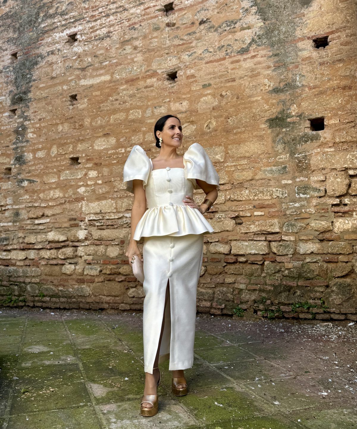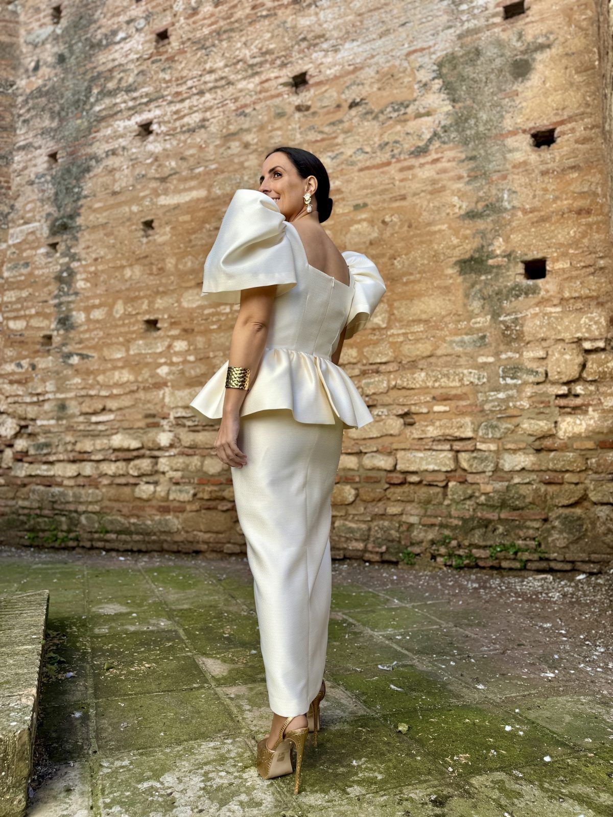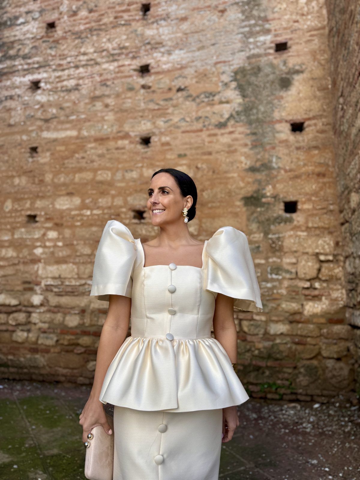 Vestido midi entallado en color beige con abertura delantera. Volante en la cintura y abotonado en la parte delantera del cuerpo con mangas abullonadas.