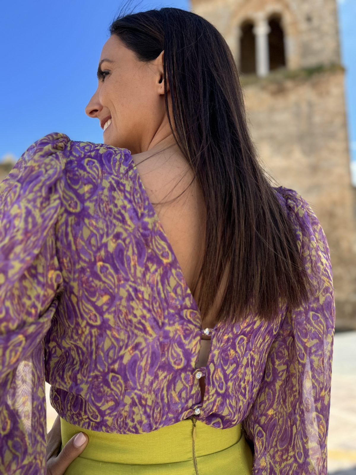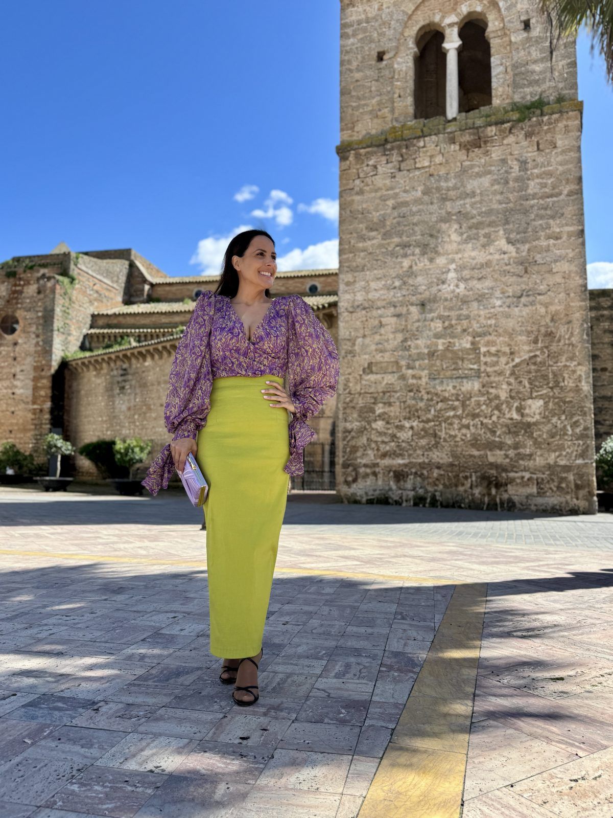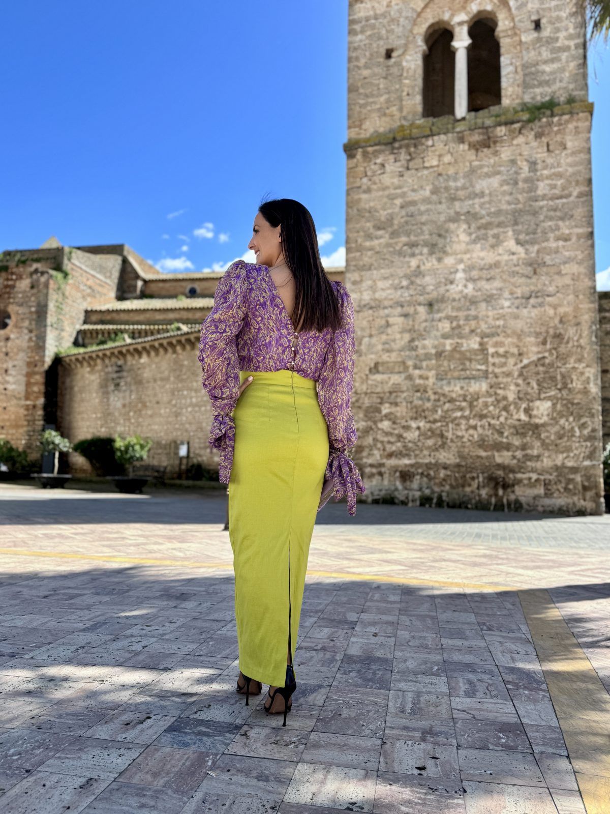 Conjunto de falda y blusa en tejido estampado y la falda de color lima. El toque de distinción lo marca la blusa que se cruza en el pechco y se abrocha en la espalda con botones joya. La falda lleva raja trasera.