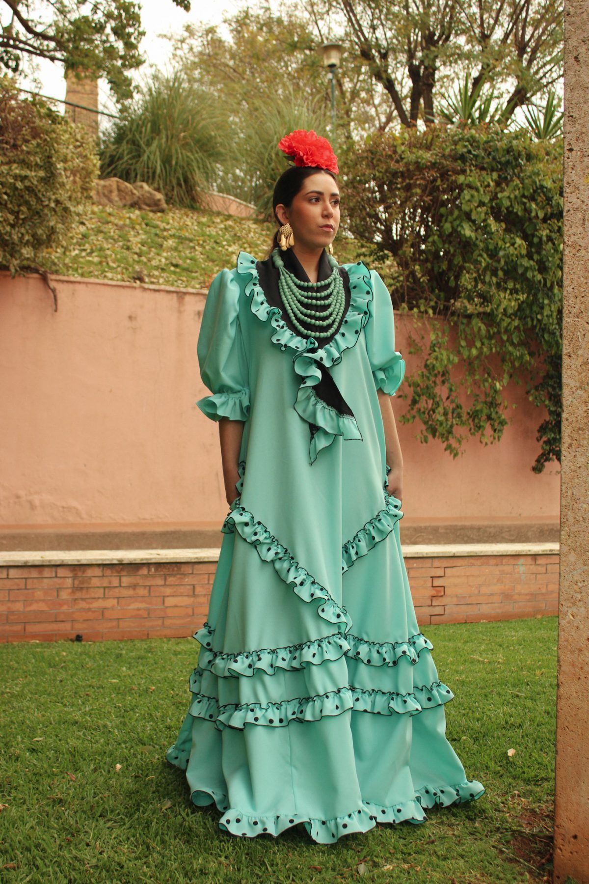Bata rociera con volantes pequeños en forma de V y en el bajo. Mantoncillo a juego con el vestido.