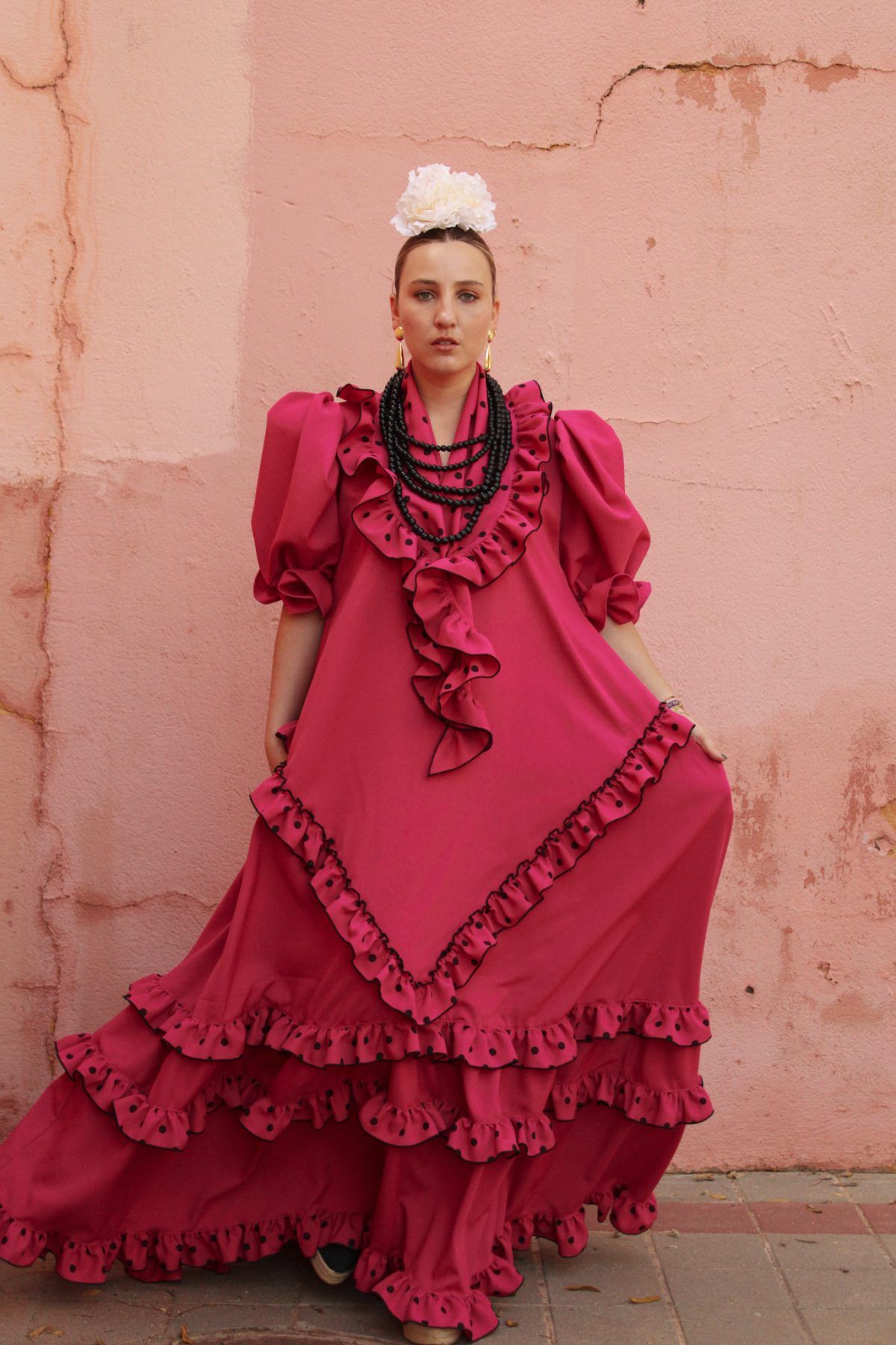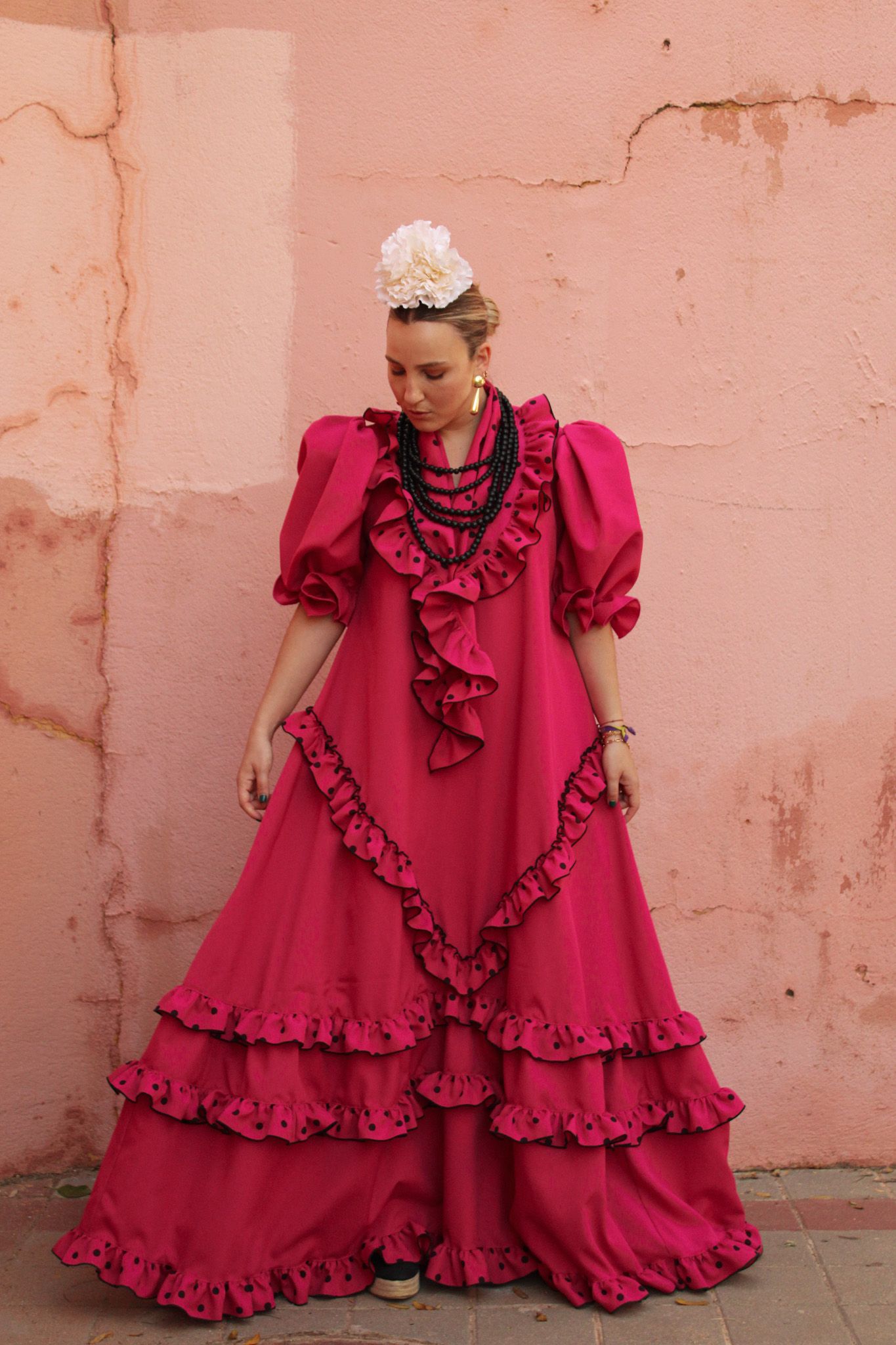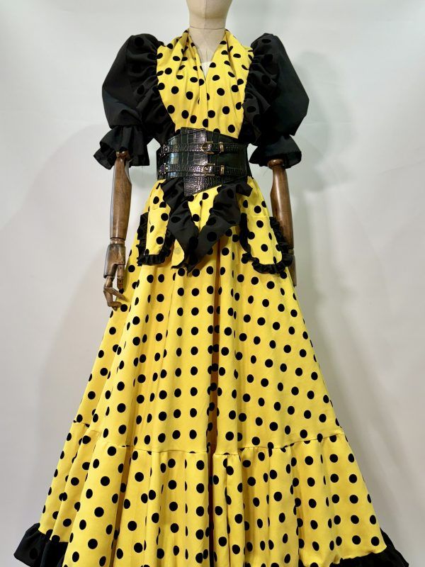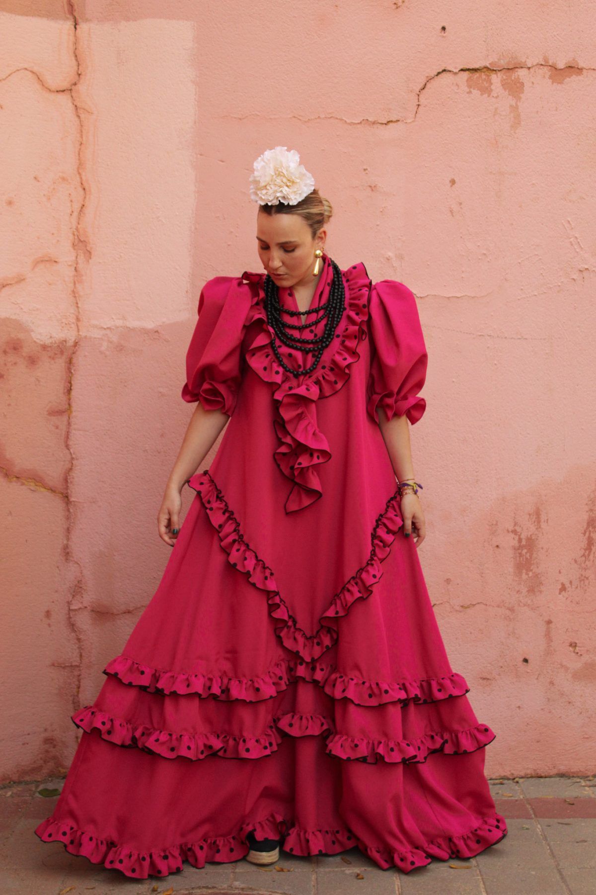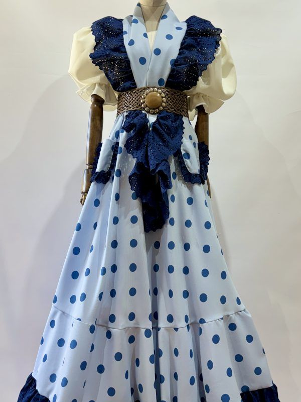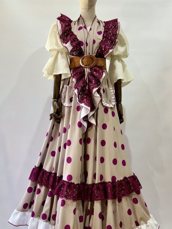 Bata rociera con volantes pequeños en forma de V y en el bajo. Mantoncillo a juego con el vestido.
